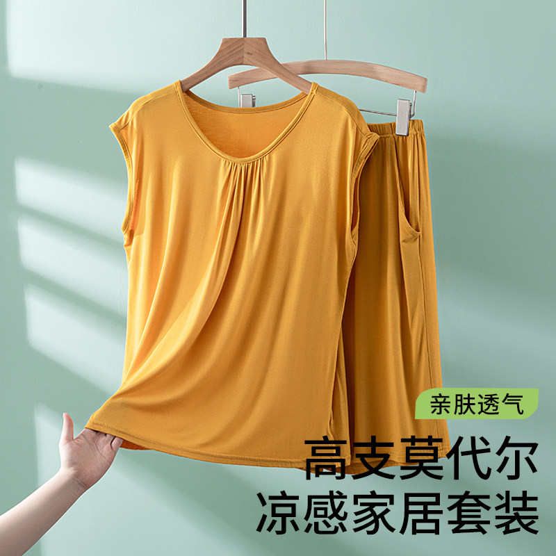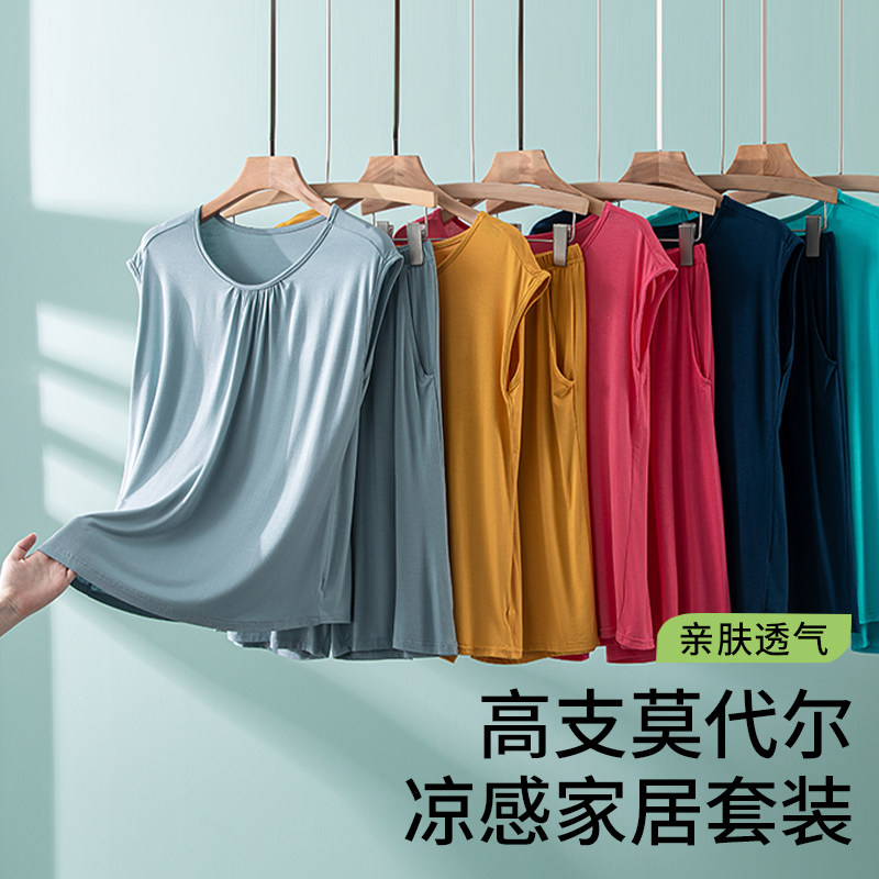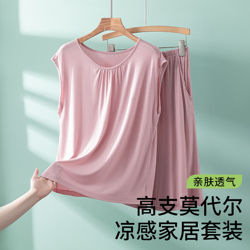 猫人睡衣女夏款圆领大码莫代尔短裤套装2023新款宽松薄款家居外穿