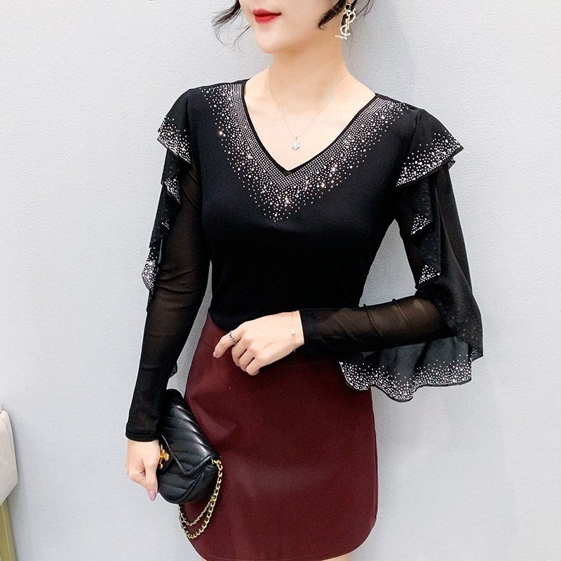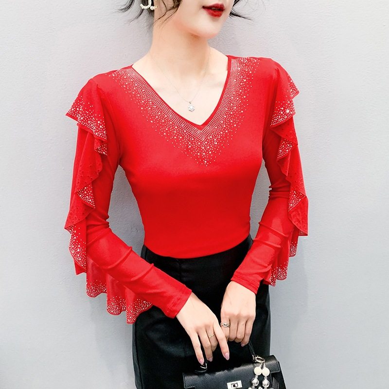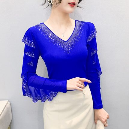 新款广场舞上衣女V领烫钻荷叶边长袖跳舞衣弹力显瘦水兵摩登舞衣
