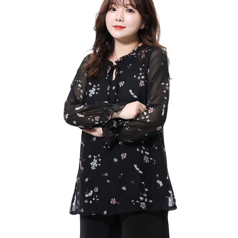 胖MM春大码雪纺上衣加肥加大宽松显瘦印花遮肚子雪纺衫200斤女装