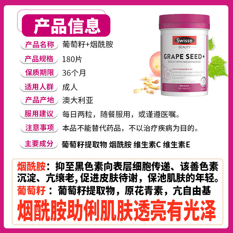 斯维诗Swisse烟酰胺葡萄籽片180粒花青素精华焕肤焕白片