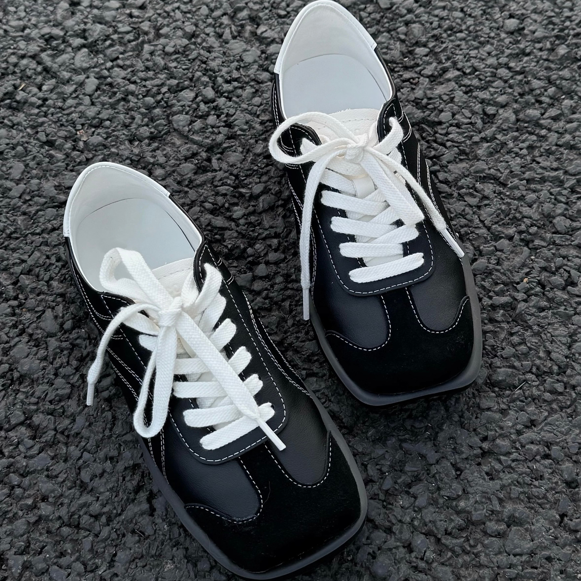 李兰迪同款黑色不对称德训鞋男女款2025新款真皮厚底休闲阿甘板鞋