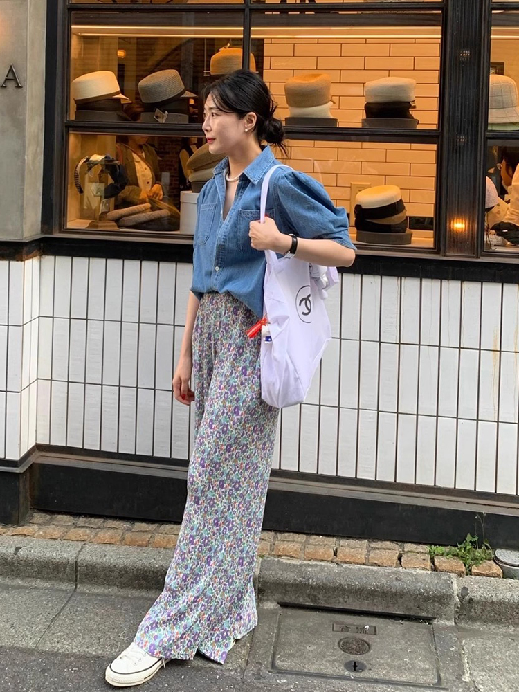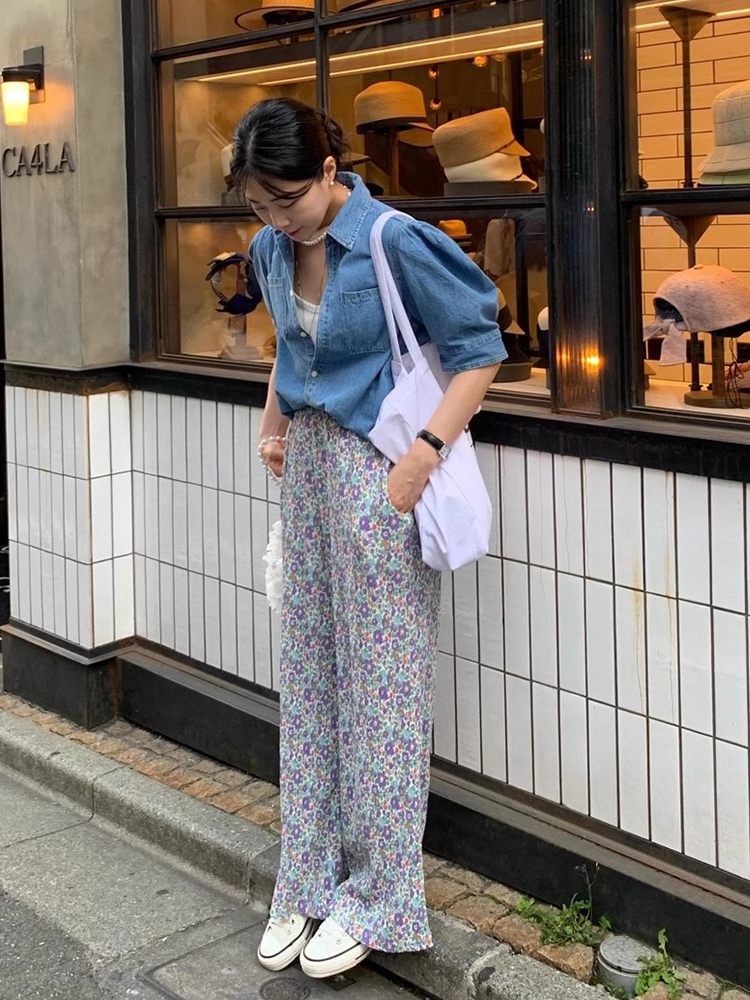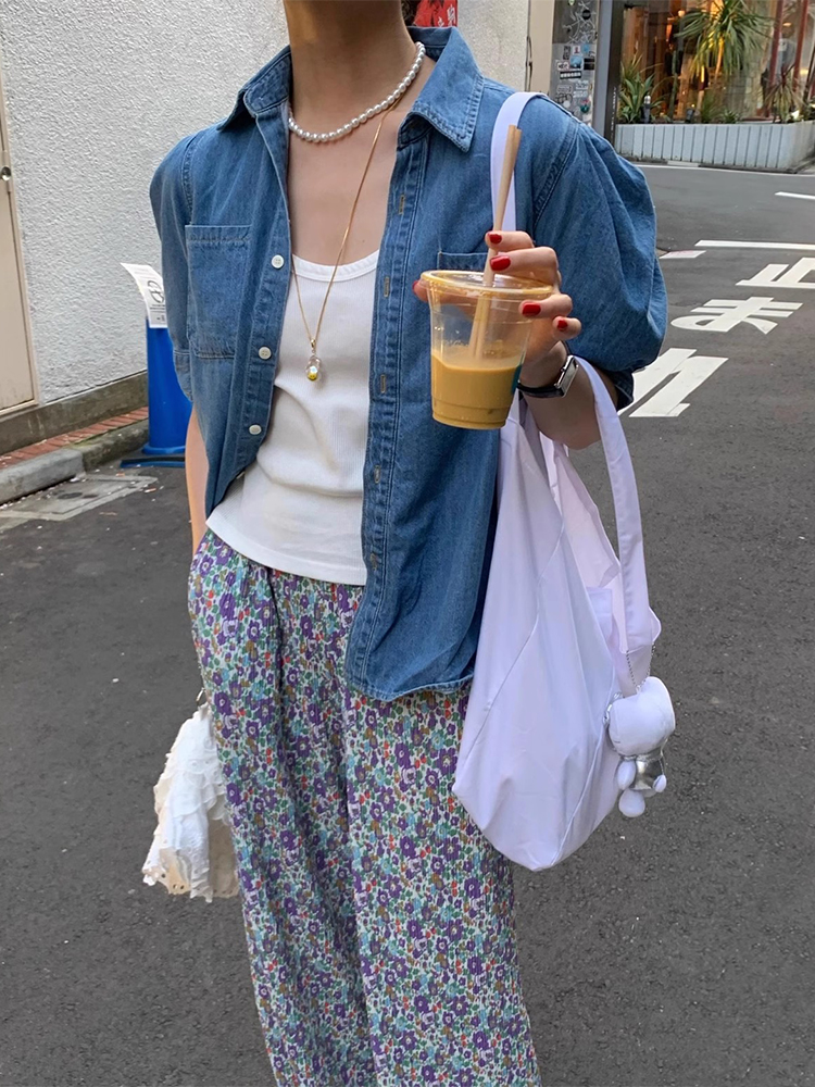 牛仔衬衫外套+褶皱碎花阔腿长裤
