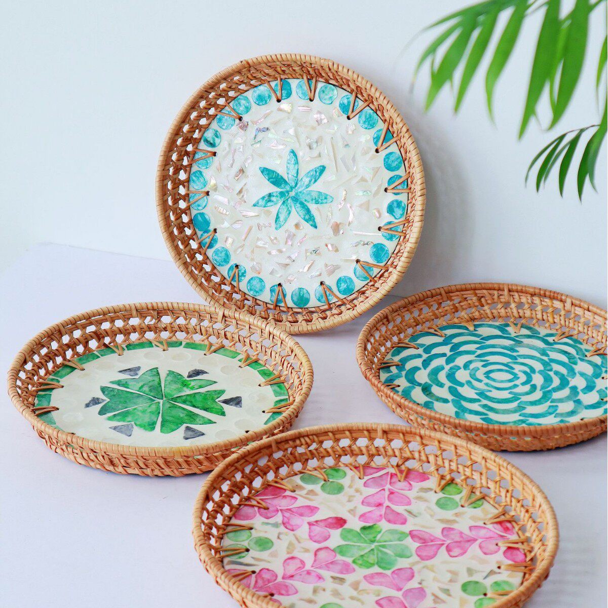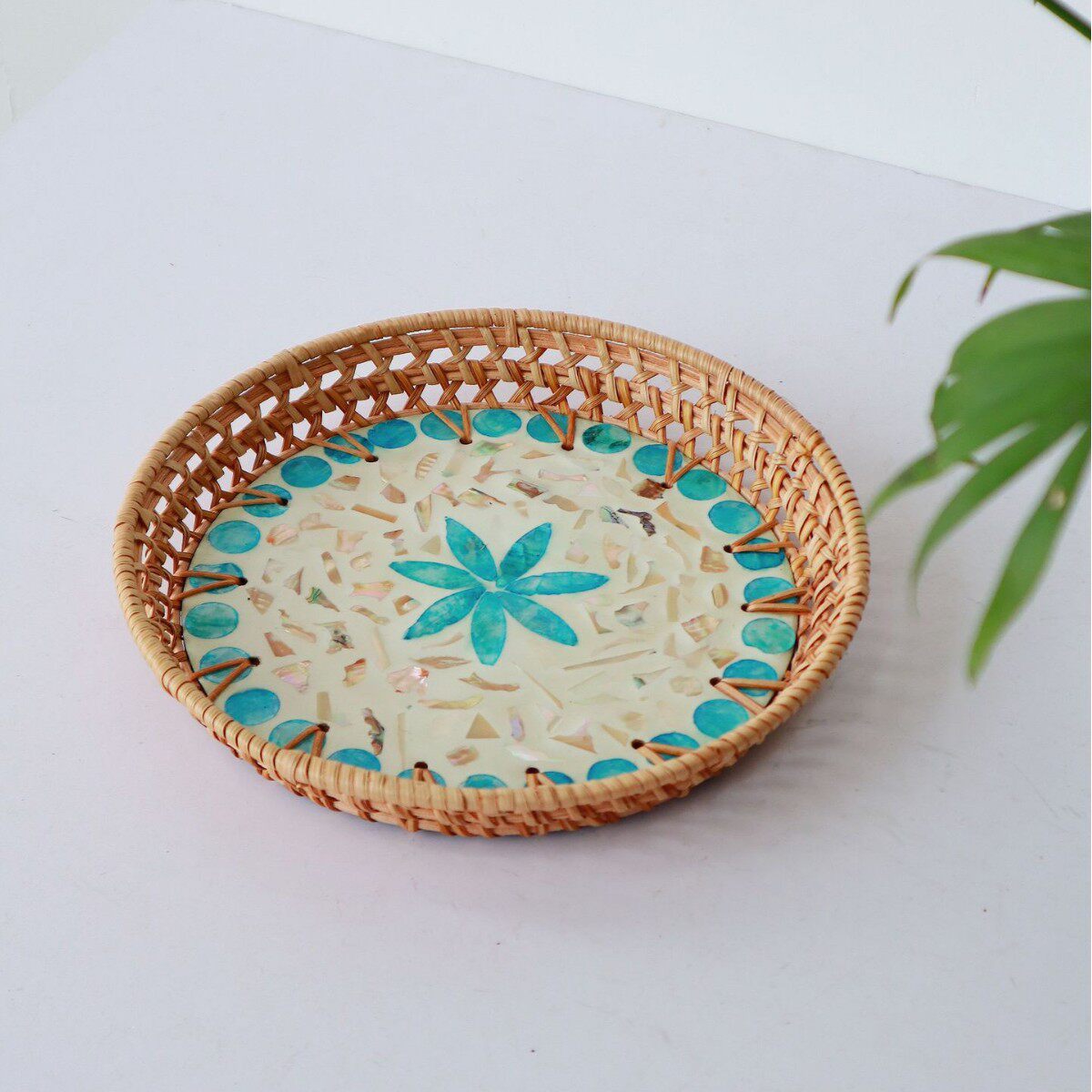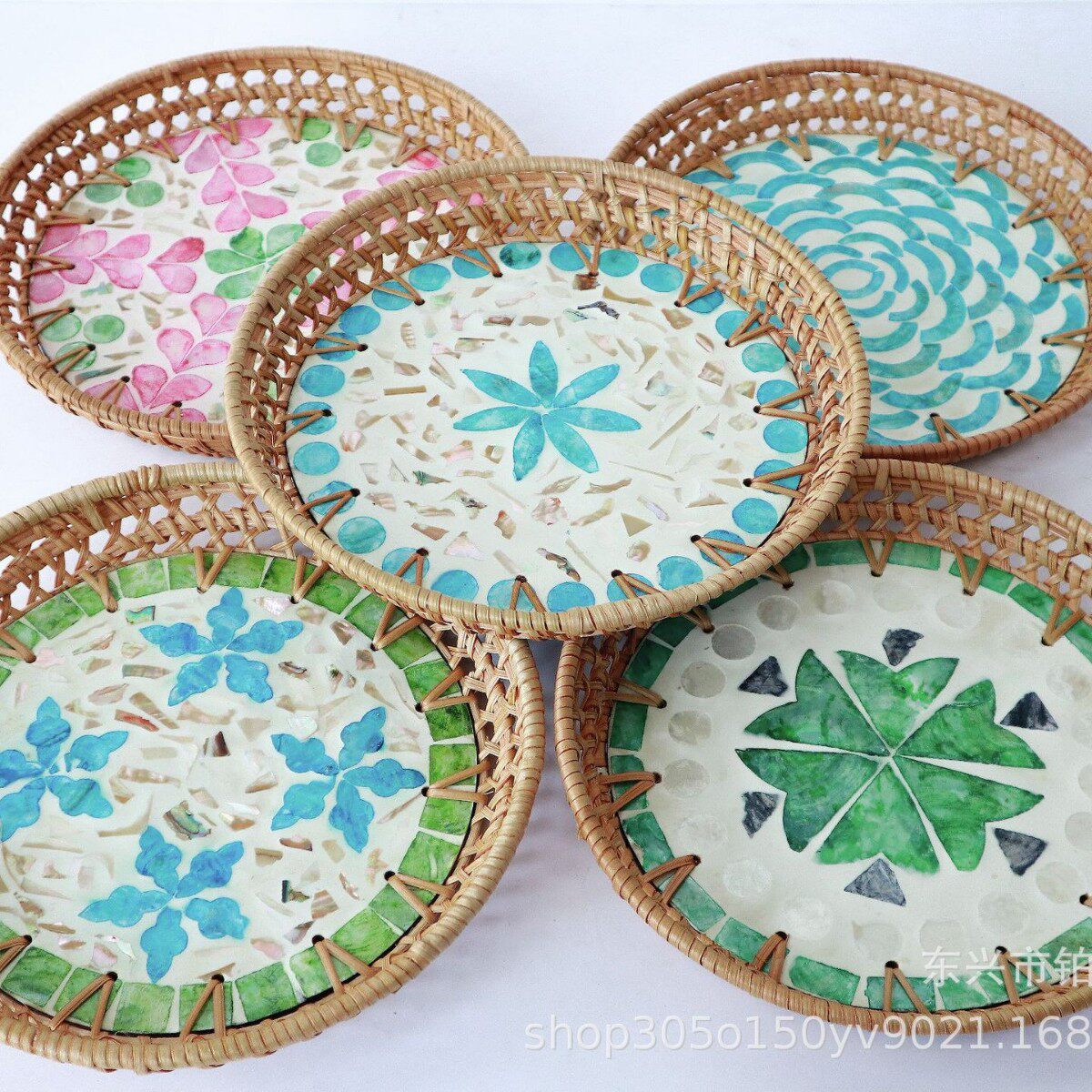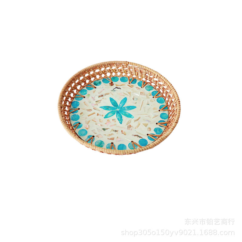 藤编贝壳托盘手工家用水果盘点心盘圆形精致多彩贝壳果盘收纳盘