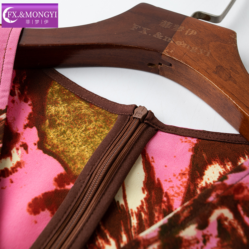 菲梦伊粉色印花连衣裙女秋装新款复古轻熟收腰女人味气质包臀裙子