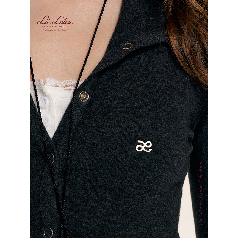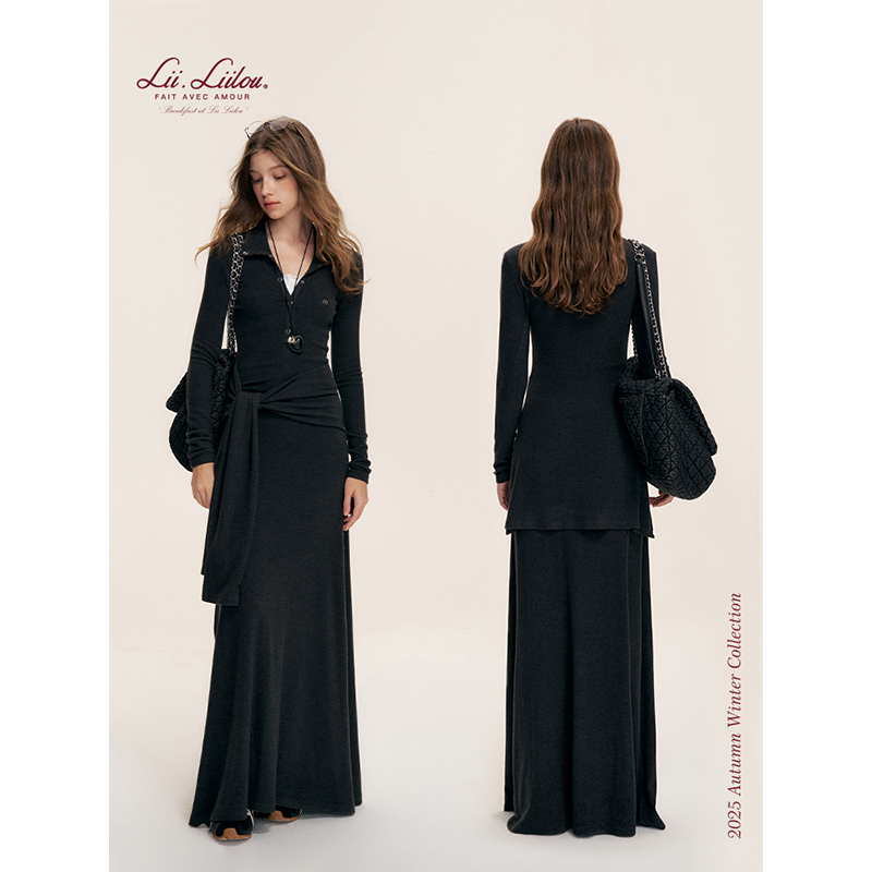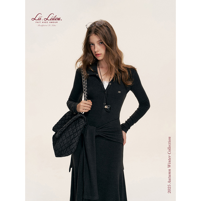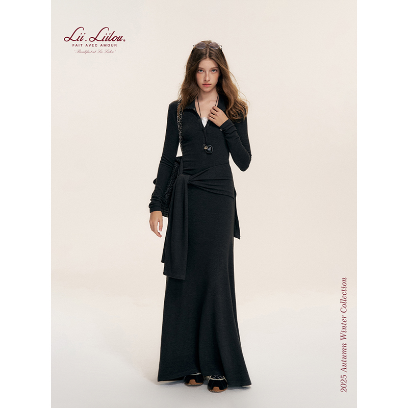 Liilou 25aw 松弛感 假两件 系带搭片修身开口翻领A摆长袖连衣裙