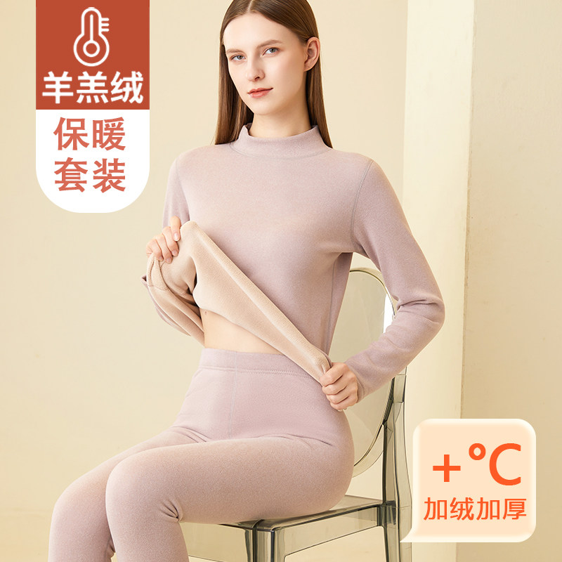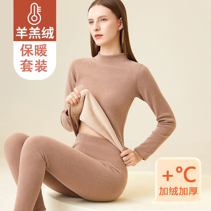 高领女士保暖内衣加绒加厚套装冬季发热羊羔绒秋衣秋裤打底棉毛衫