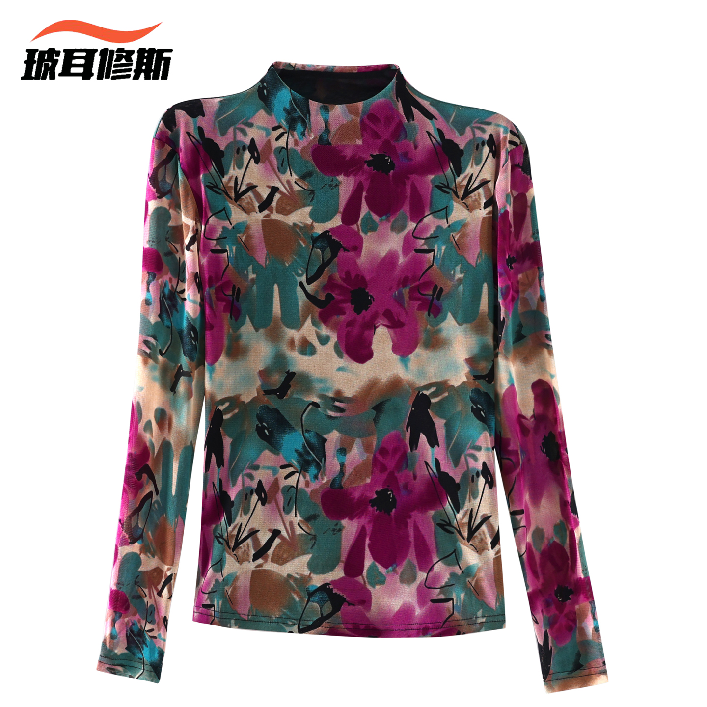 半高领独特漂亮网纱印花长袖秋冬款打底衫女洋气大码显瘦百搭上衣