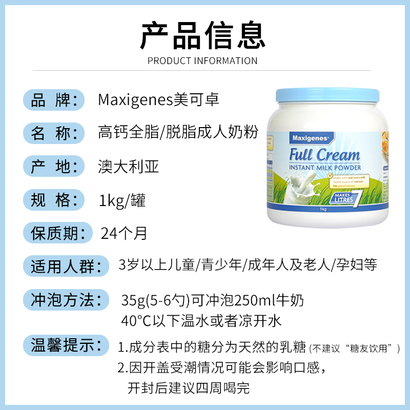 澳洲美可卓蓝胖子奶粉全脂脱脂牛奶粉成人中老年学生儿童营养高钙