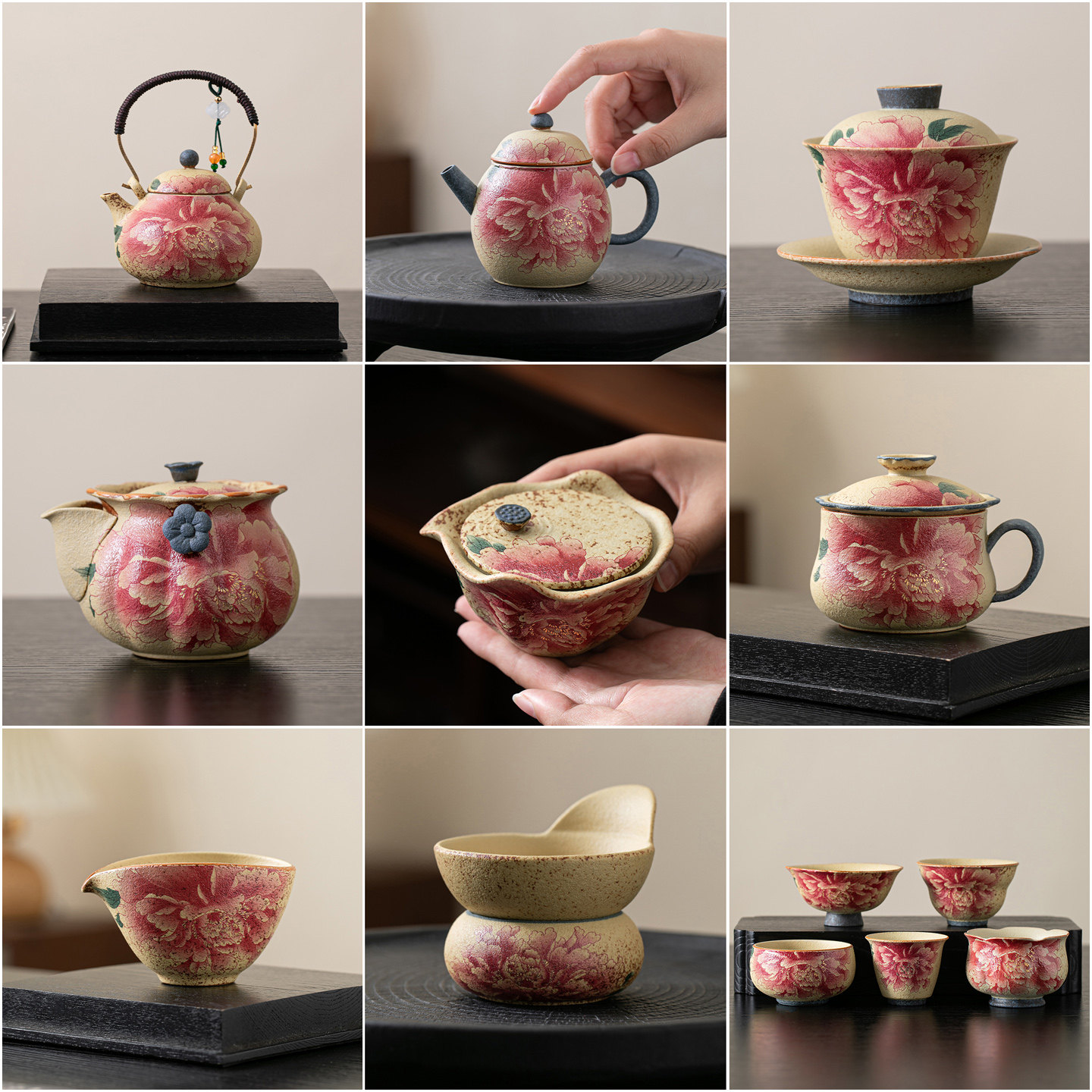 火石红陶瓷主人杯做旧复古牡丹小号单人泡茶杯家用高档茶具品茗杯