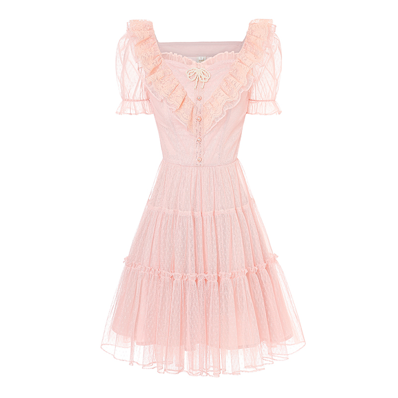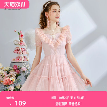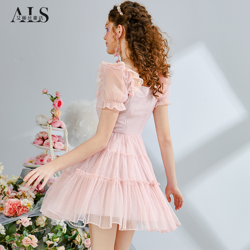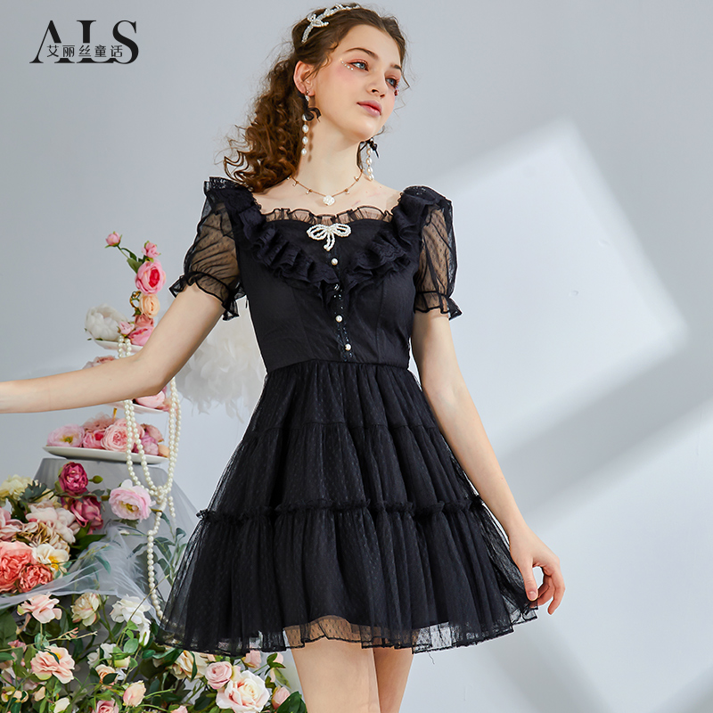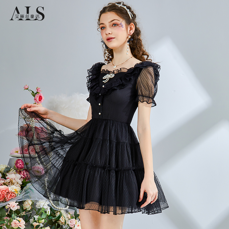 艾丽丝2025夏季新款甜美刺绣粉色短袖公主裙黑色蕾丝短款连衣裙女