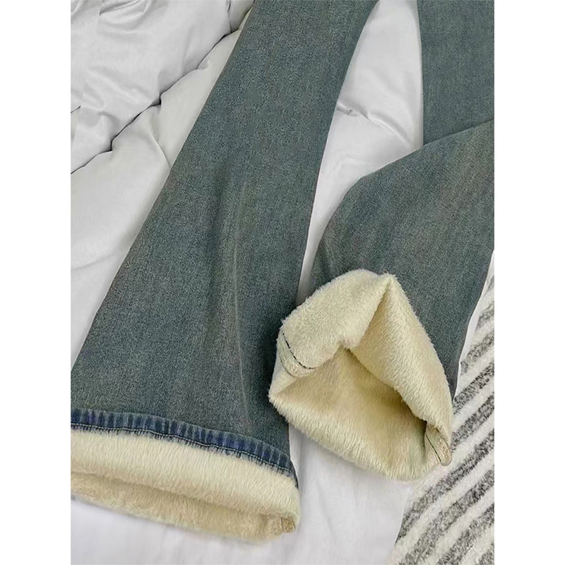 加绒加厚复古蓝微喇牛仔裤女冬季新款胖妹妹mm高腰弹力显瘦直筒裤