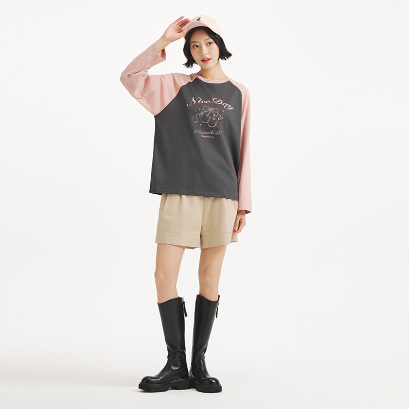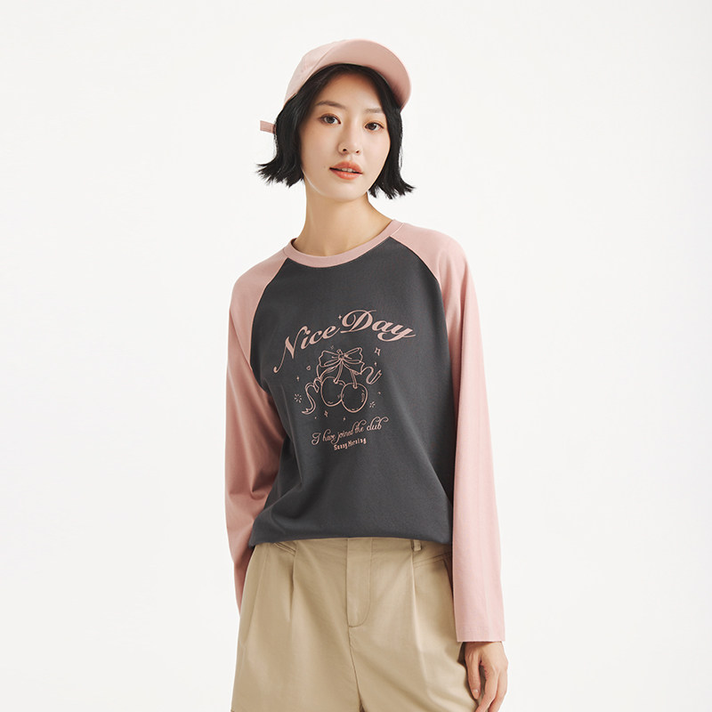 热风女士长袖T恤上衣2025年秋季新款水果字母插肩袖显瘦内搭长T恤