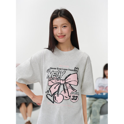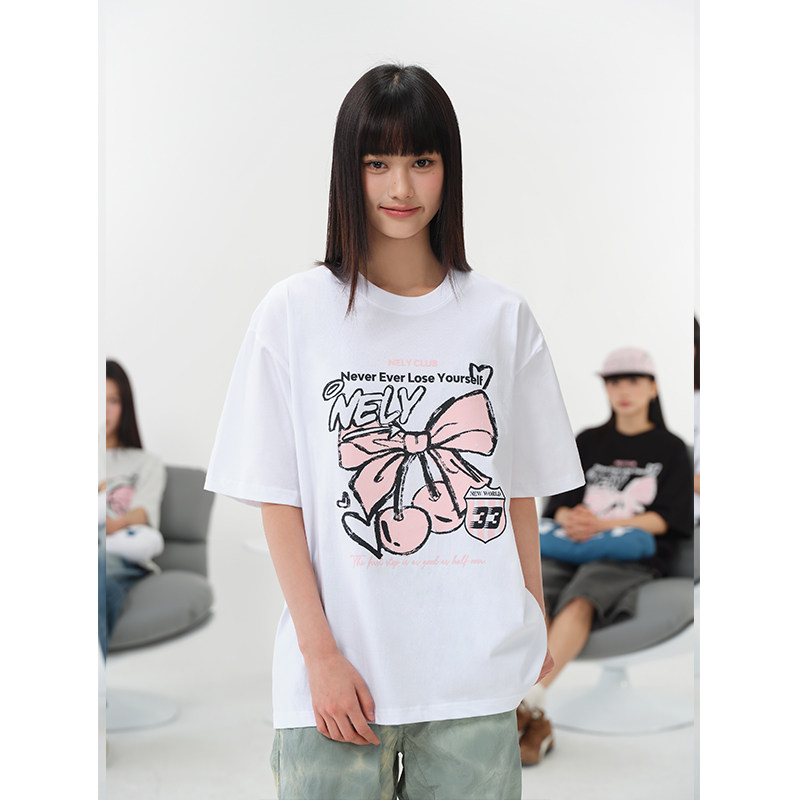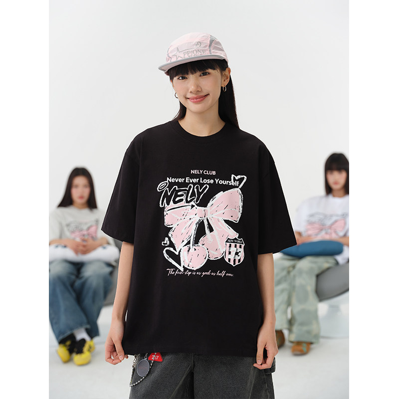 NELY小尼力字母蝴蝶结樱桃印花短袖t恤夏季学院风纯棉体恤潮男女