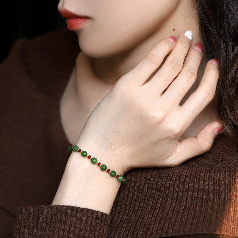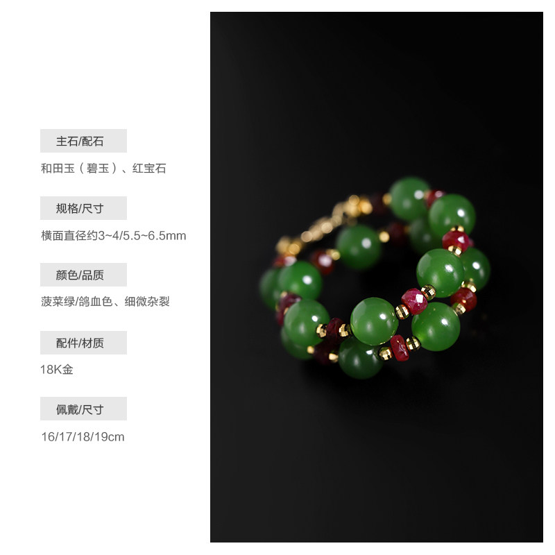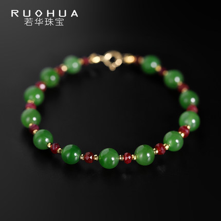 若华珠宝绿梅=满天星和田玉碧玉手链女18K金玉石手串红宝石手饰