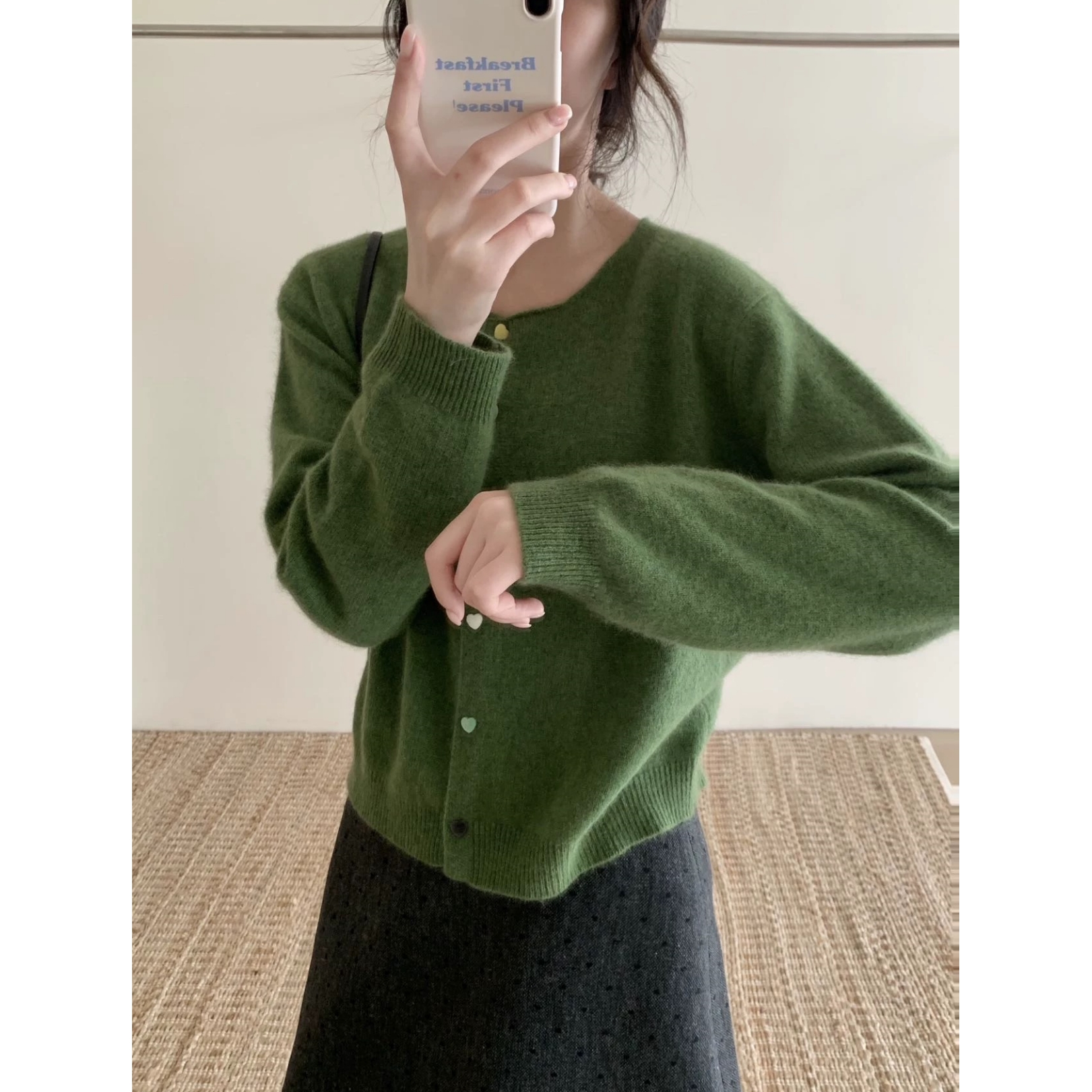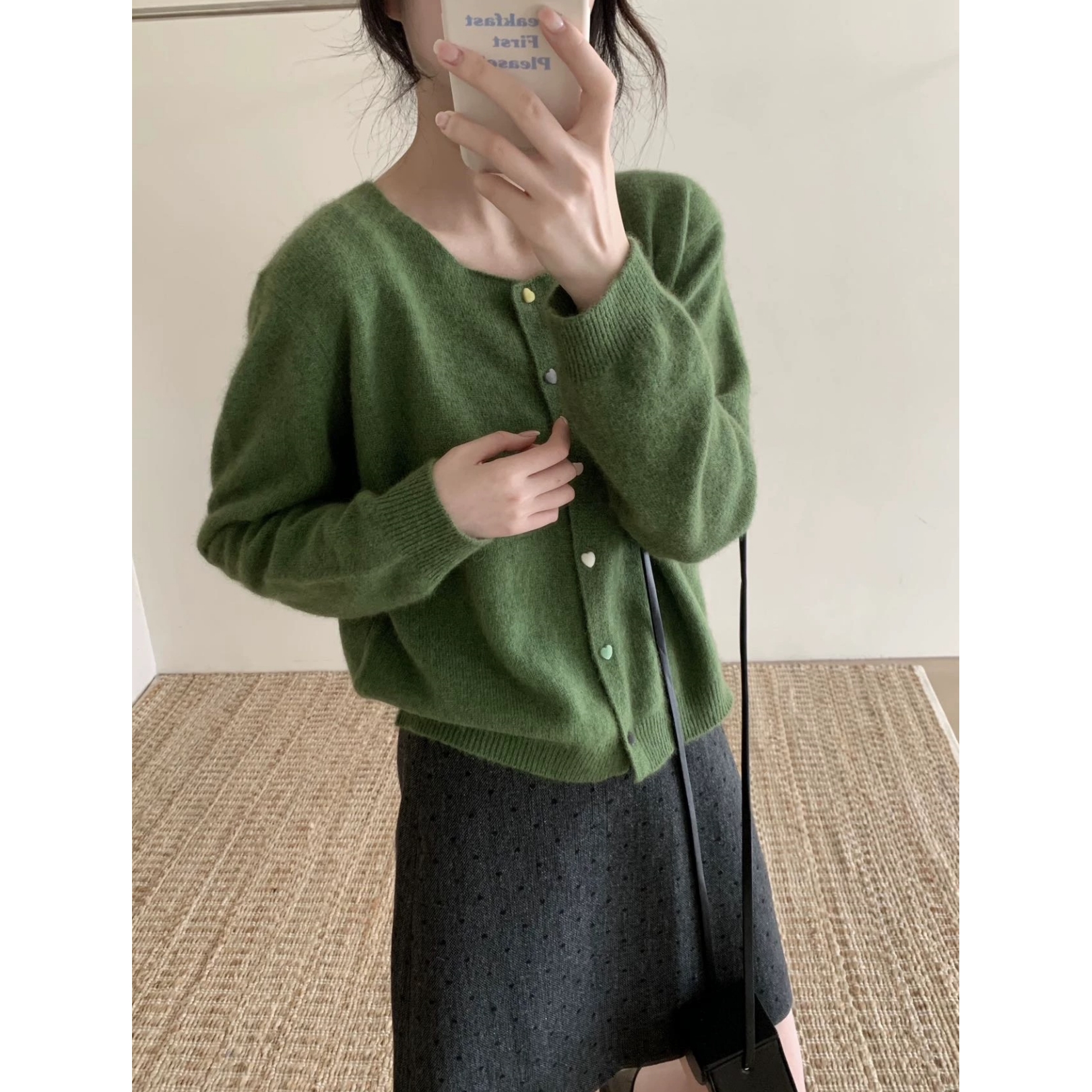 RC【爱心彩扣花绿开衫】秋季新款女士针织衫宽松外穿毛衣爆
