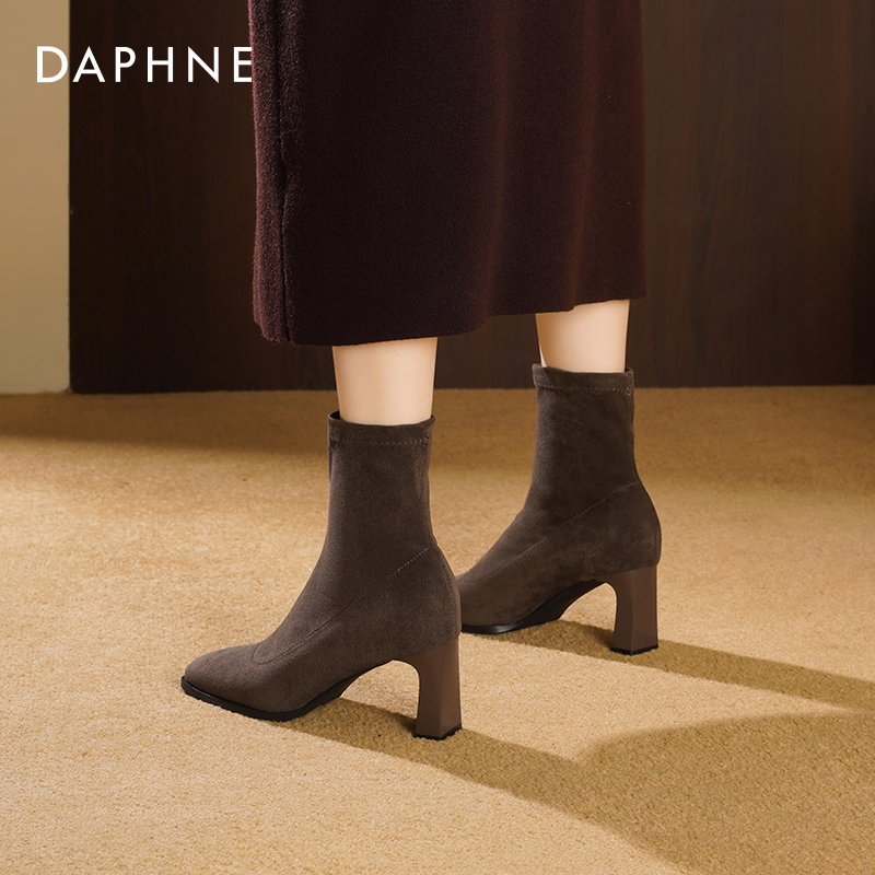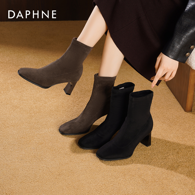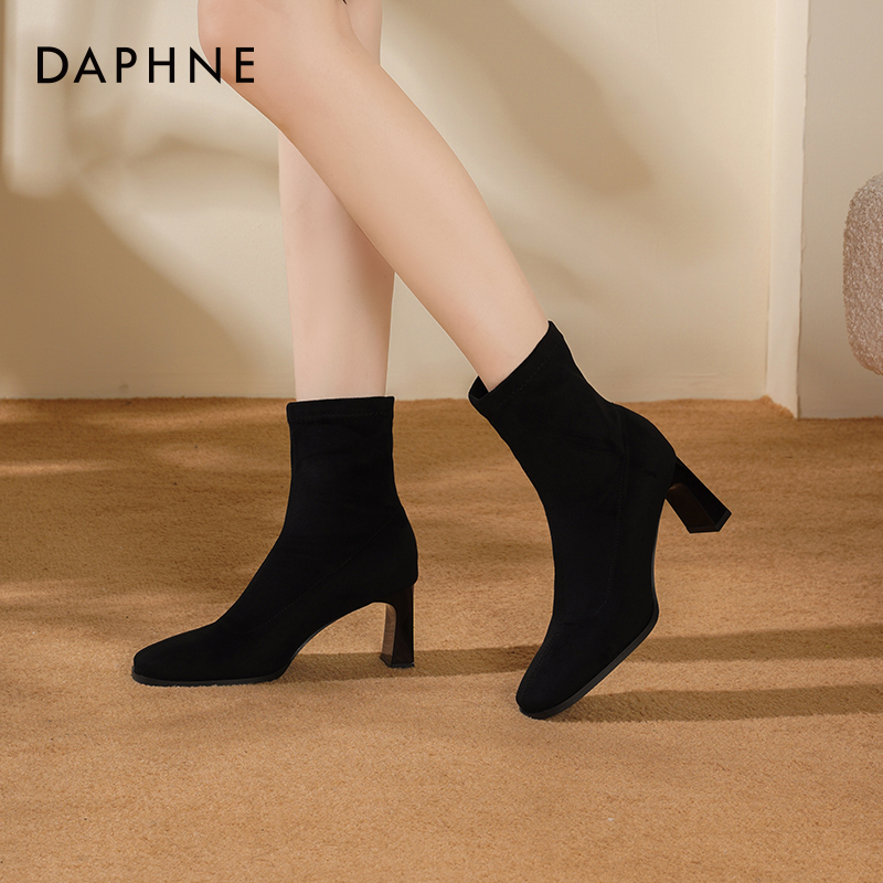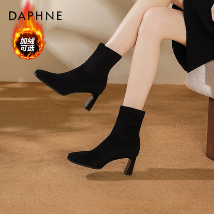达芙妮尖头高跟短靴子女2025新款爆款冬季黑色绒面弹力靴瘦瘦靴女