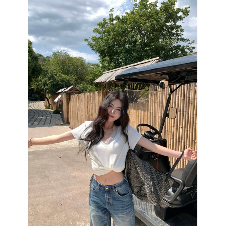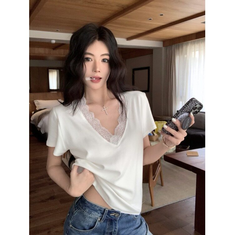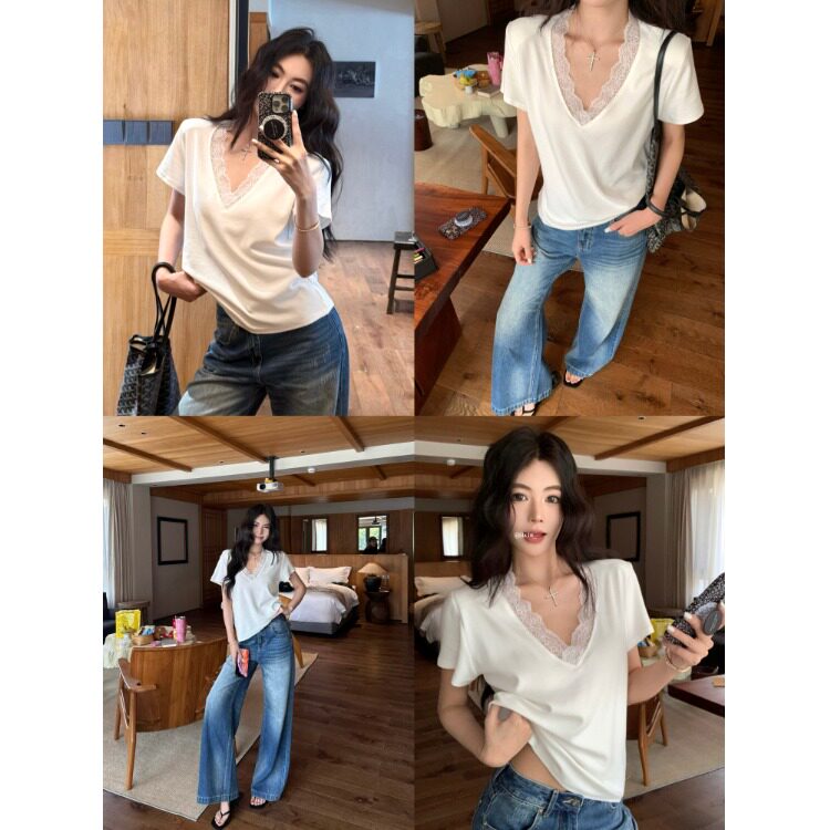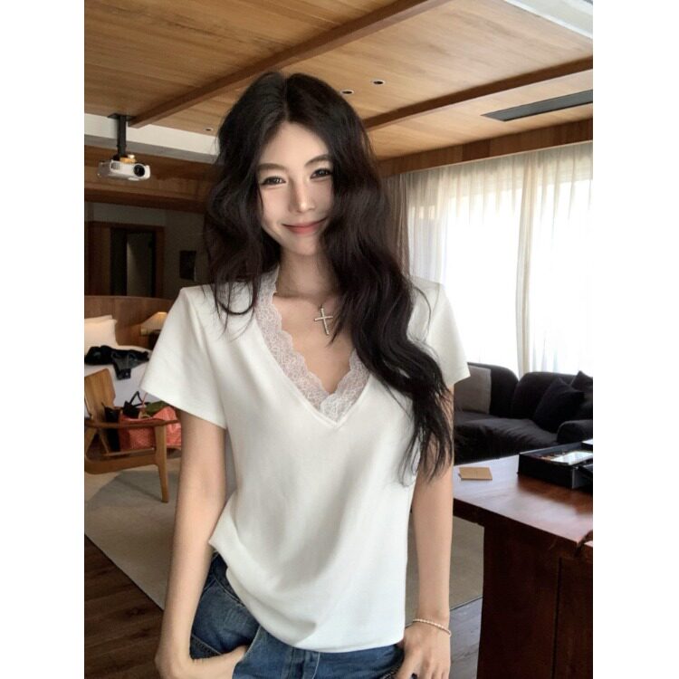 宽松休闲短袖T恤女2026夏季新款V领拼接蕾丝白色内搭打底衫上衣