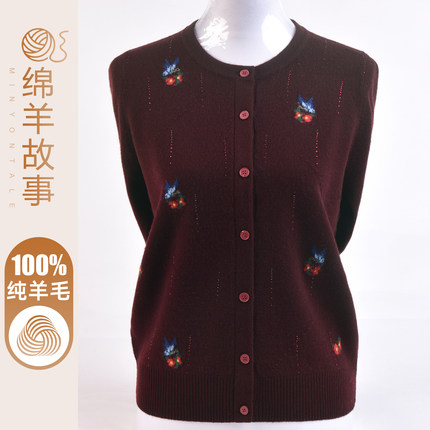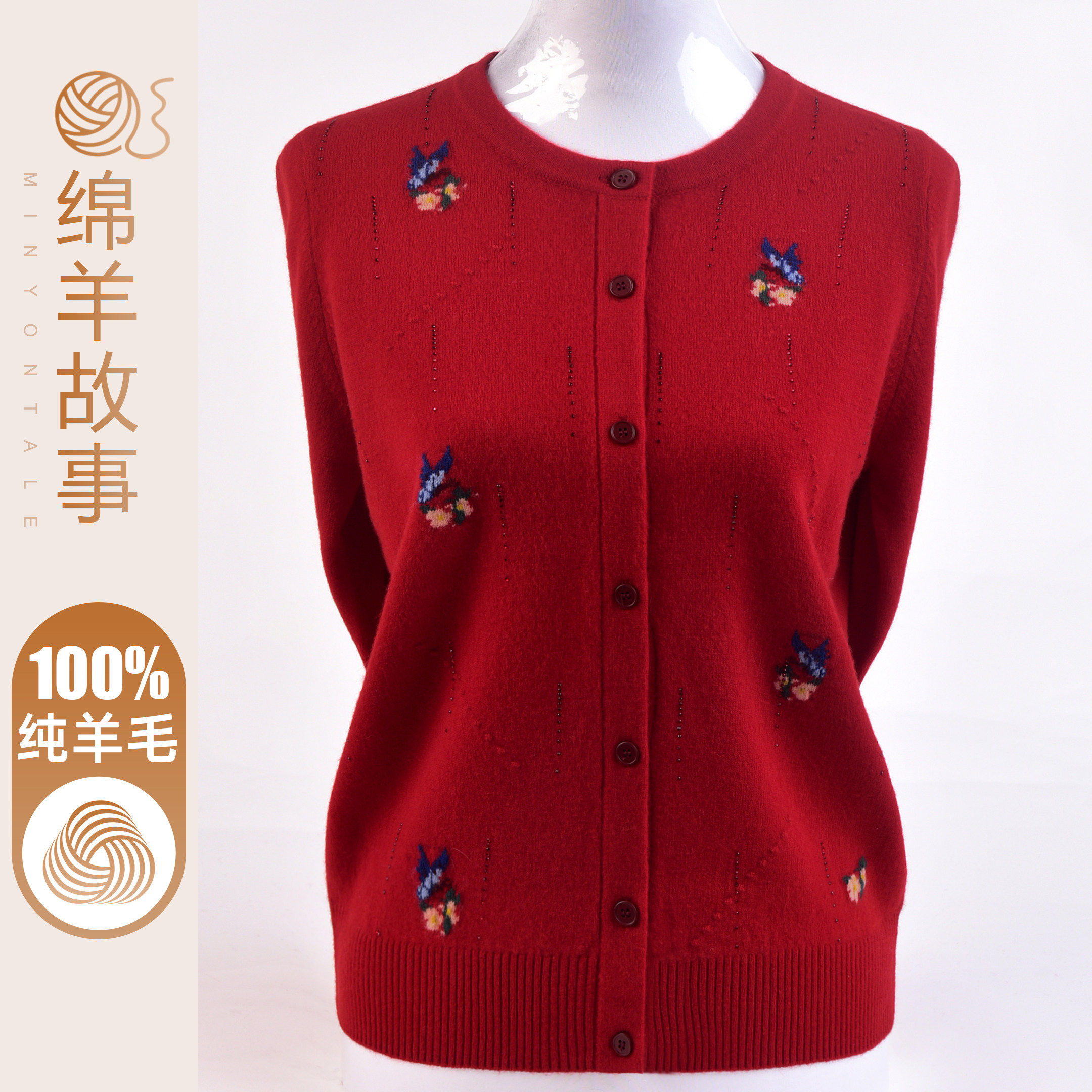 秋冬100纯羊毛衫圆领气质妈妈打底衫中老年女装针织开衫毛衣外套