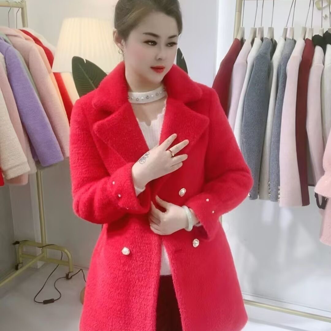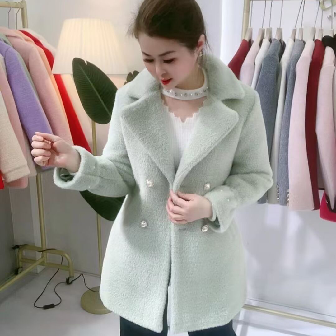 舞歌妹小个子仿水貂绒外套女中长款西装领双排扣秋冬毛呢加厚大衣