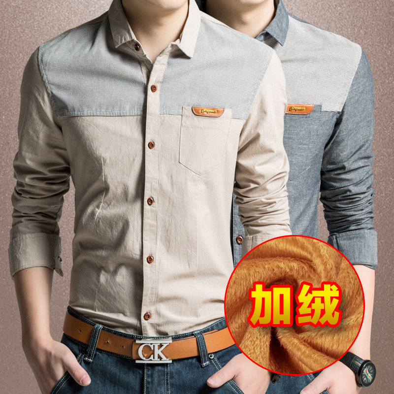 秋季男士牛津纺休闲韩版修身长袖衬衣棉加厚加绒衬衫大码牛仔保暖