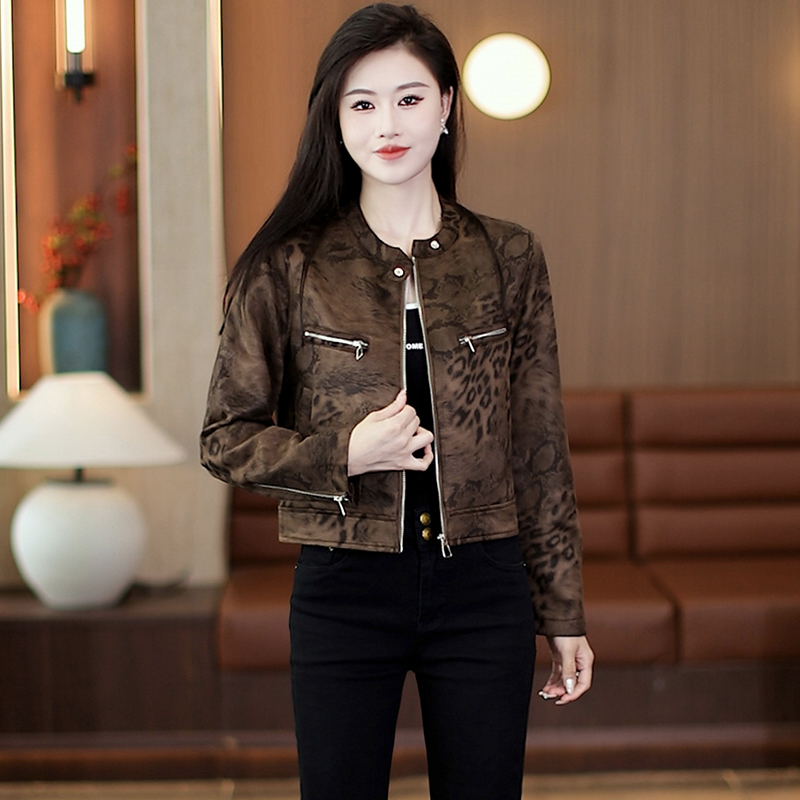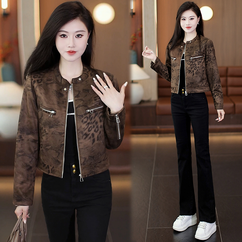 美式复古迷彩短款皮衣外套女2025秋季新款辣妹百搭立领机车服上衣