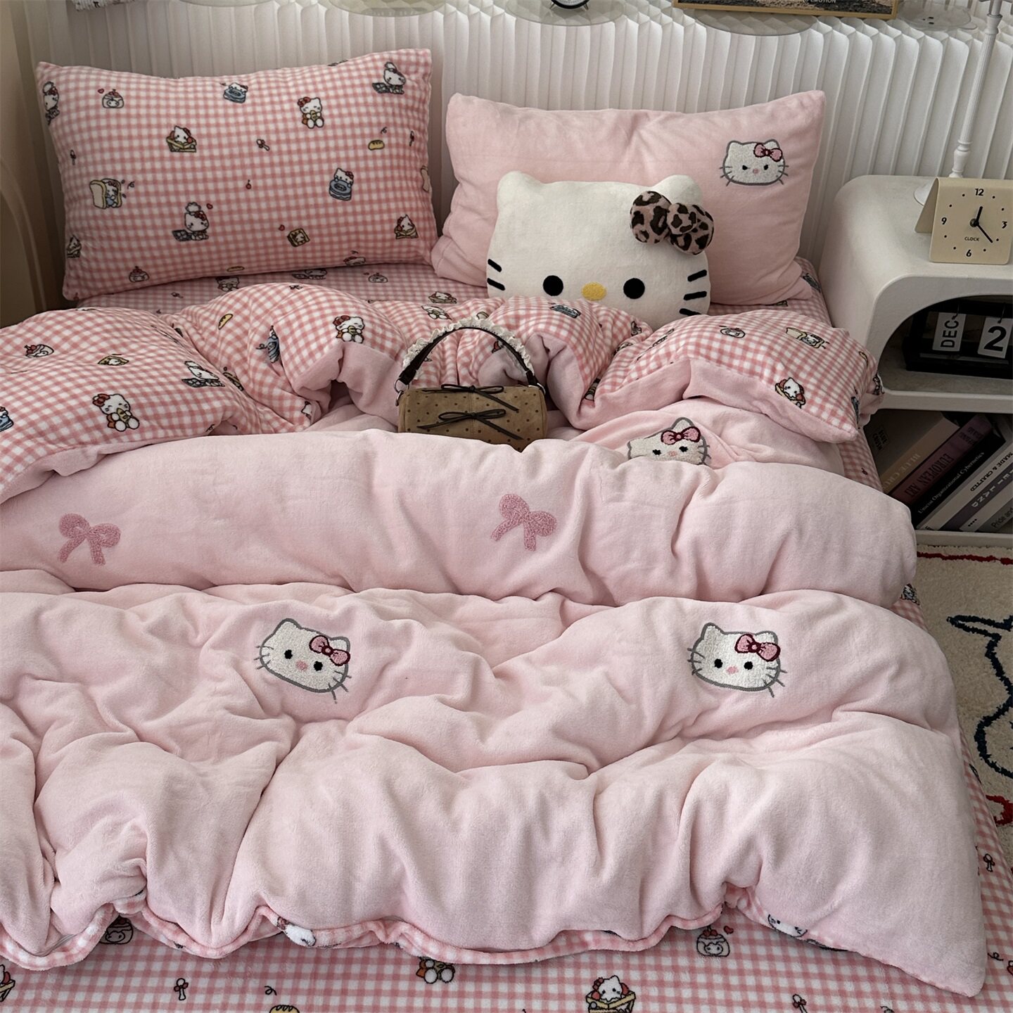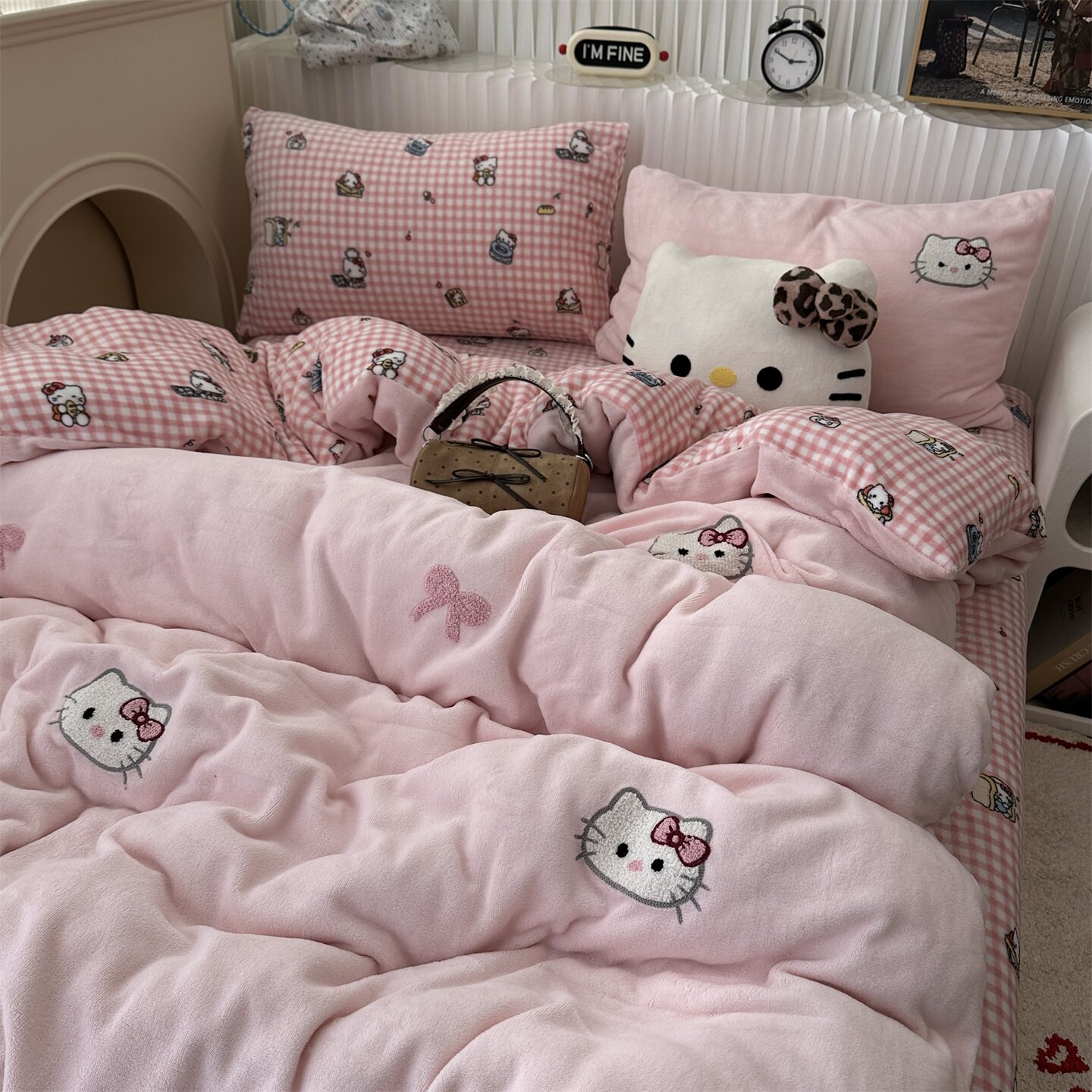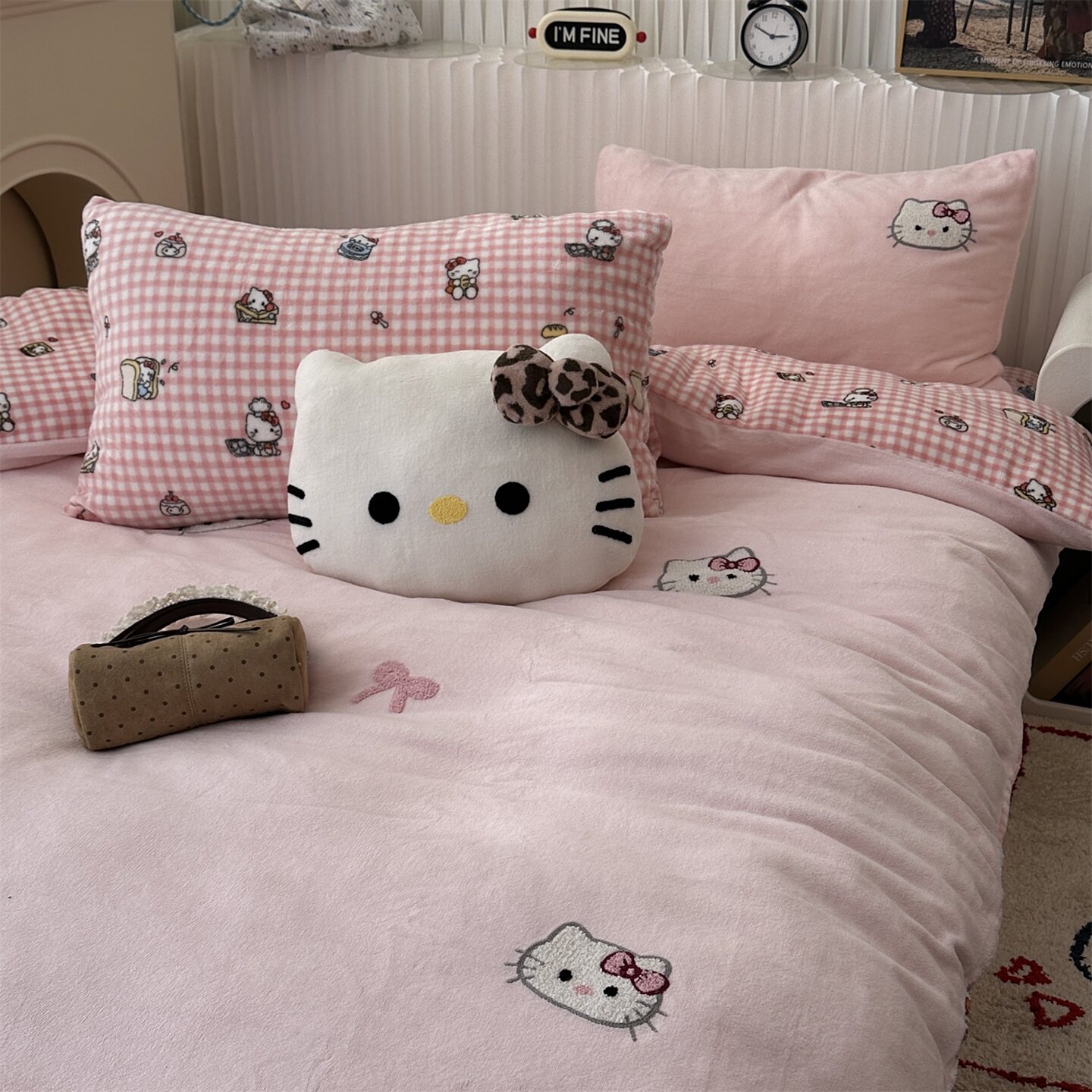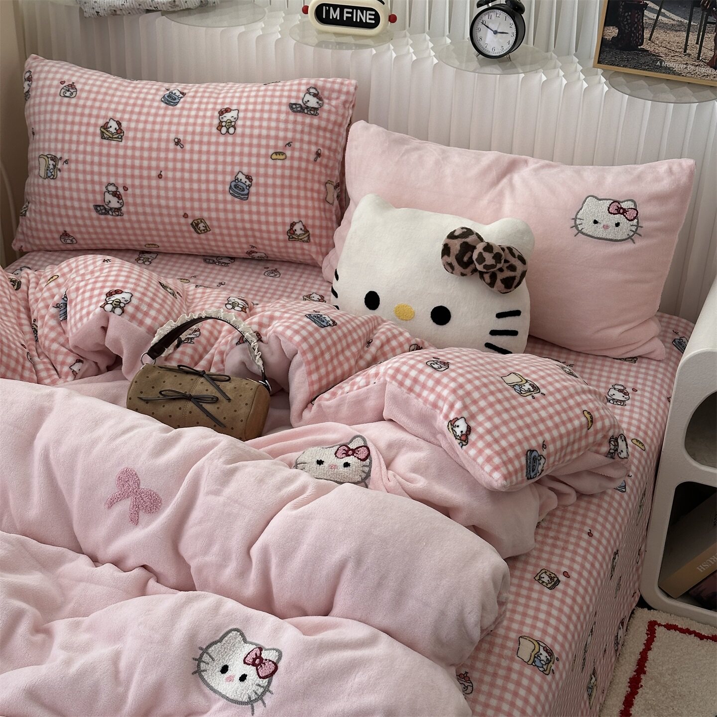 ins粉色少女心可爱KT猫咪毛巾绣牛奶绒四件套冬天珊瑚绒三件套1.8