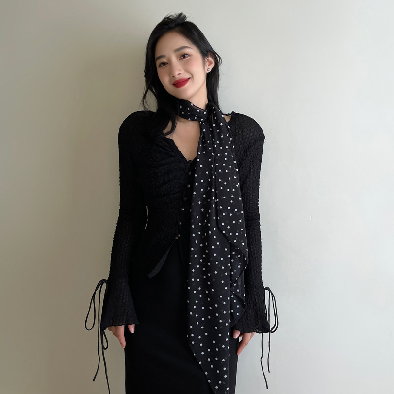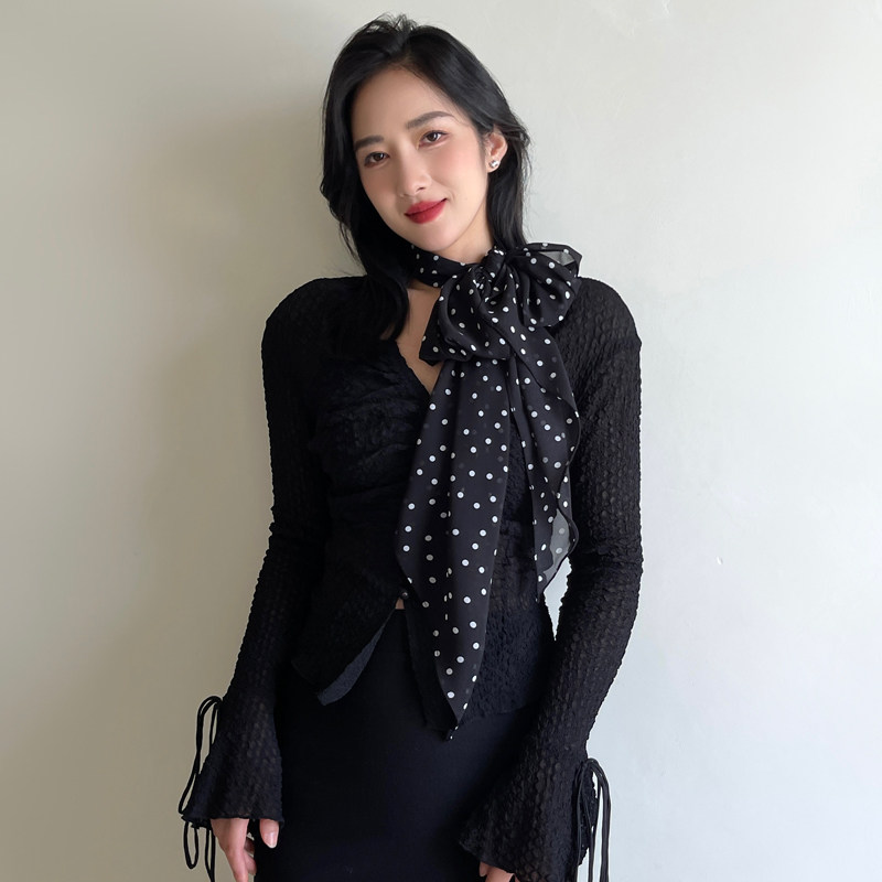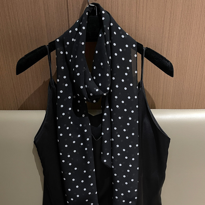 甜美复古小波点雪纺丝巾女细窄薄款装饰长条围巾时尚百搭领巾飘带