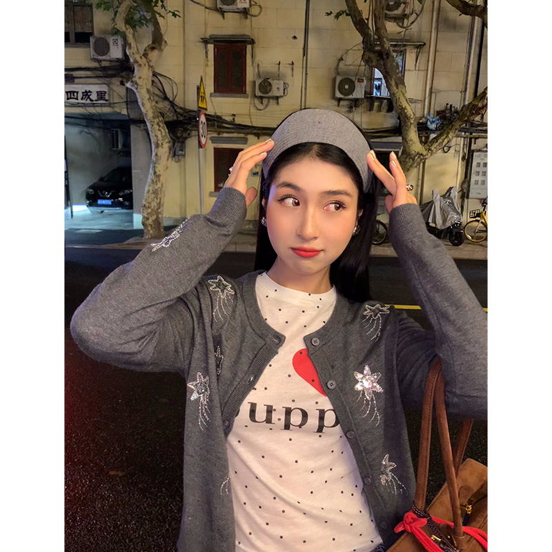 今屿花花灰色亮片针织衫女毛衣针织开衫早秋2024新款春秋刺绣外套
