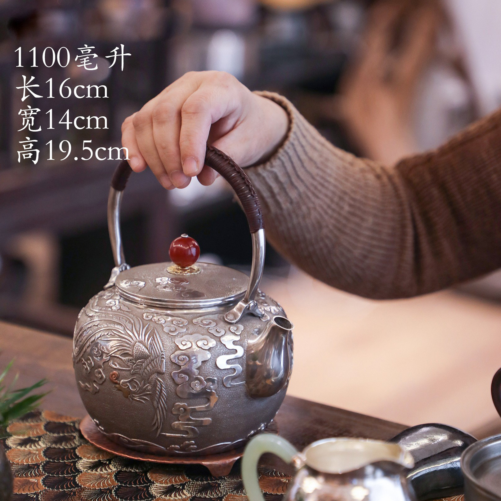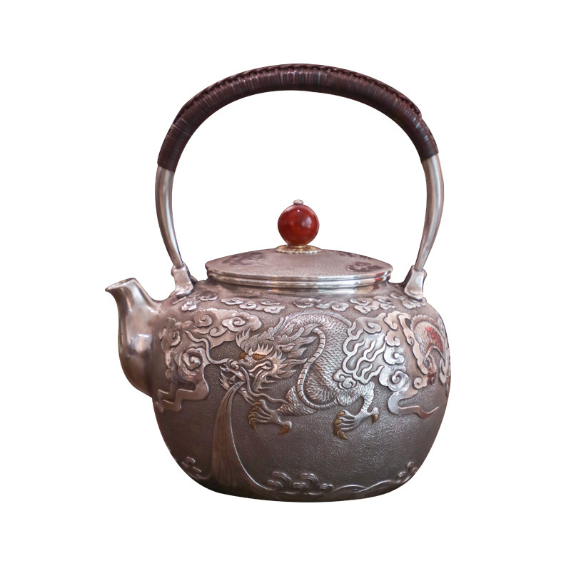 纯银时代錾刻祥云龙凤呈祥烧水银壶足银999纯手工一张口打出1.1升