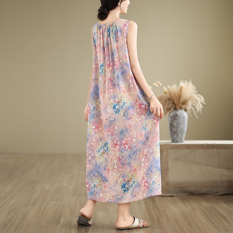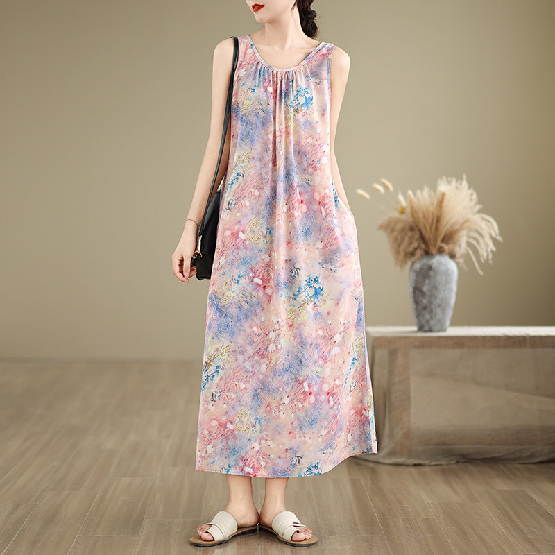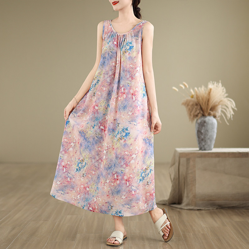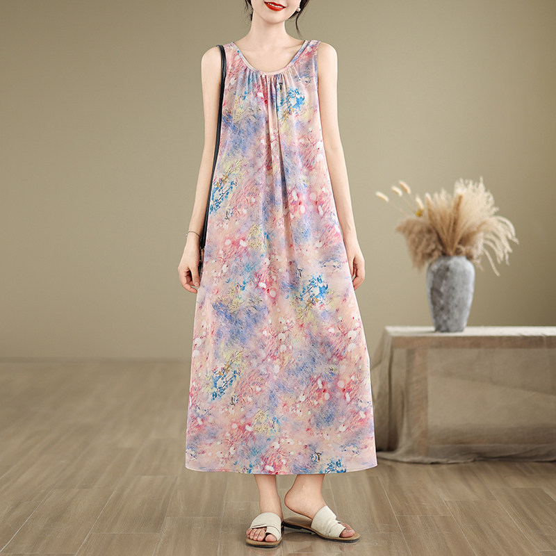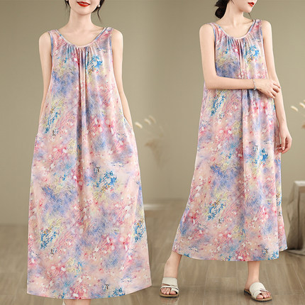 实拍2026夏季新款无袖连衣裙宽松型圆领印花长裙女