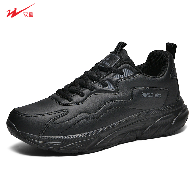 双星特大码男鞋全黑色革面防水运动鞋男士休闲爸爸百搭软底旅游鞋