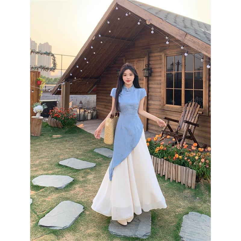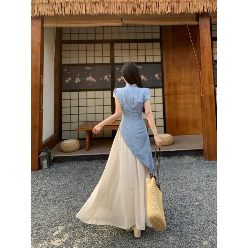 大码假两件复古连衣裙女夏季新中式国风裙子胖mm收腰显瘦a字长裙