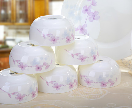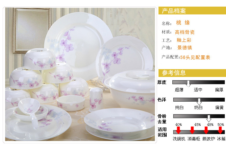 送2面碗骨瓷套装 景德镇瓷器56头优质骨瓷桃园餐具套装碗盘碟子