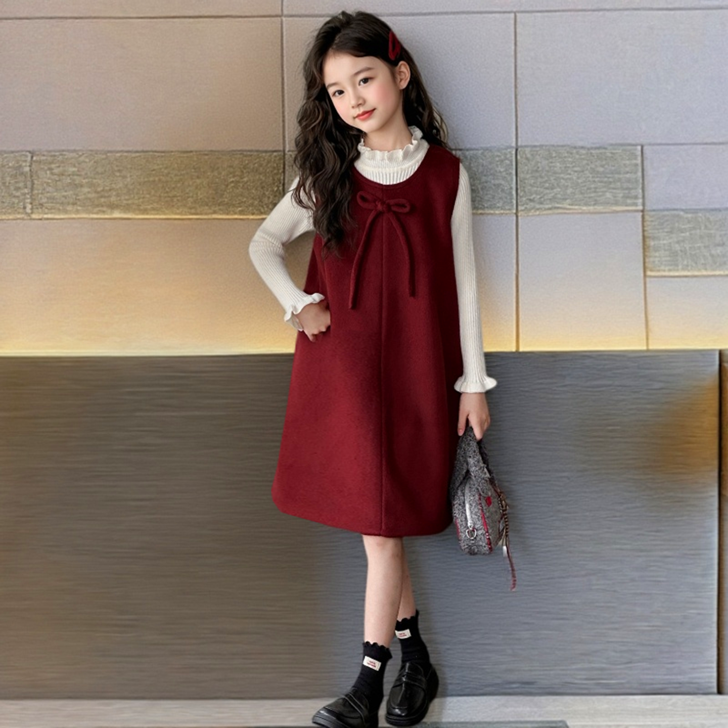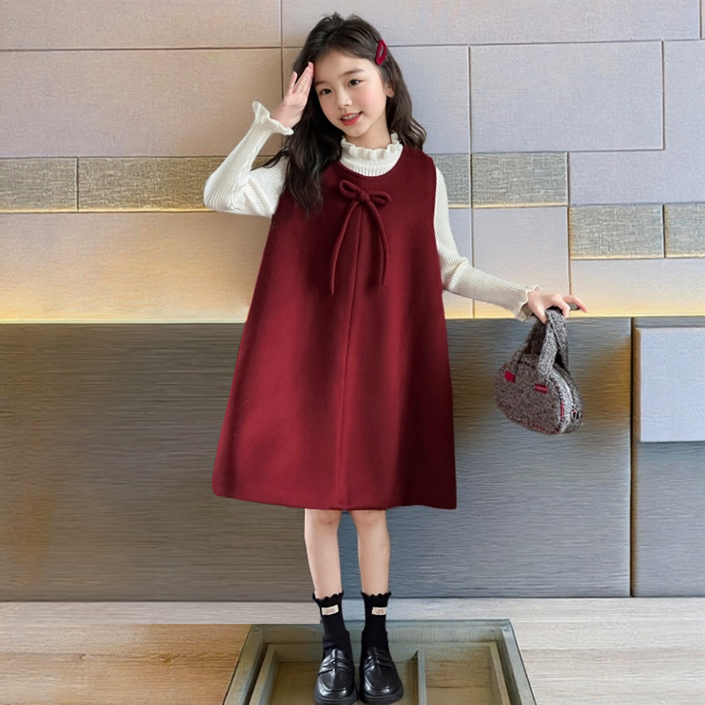 女童红色毛呢背心裙套装