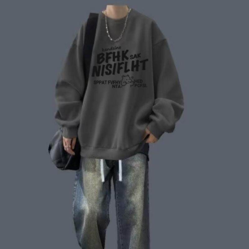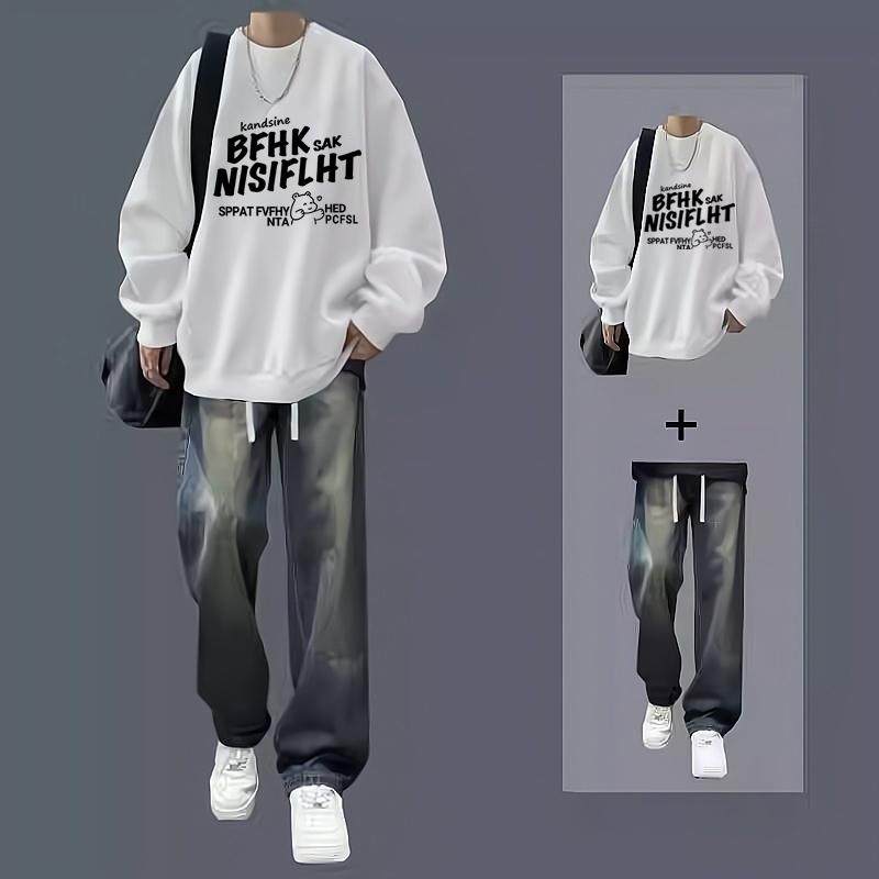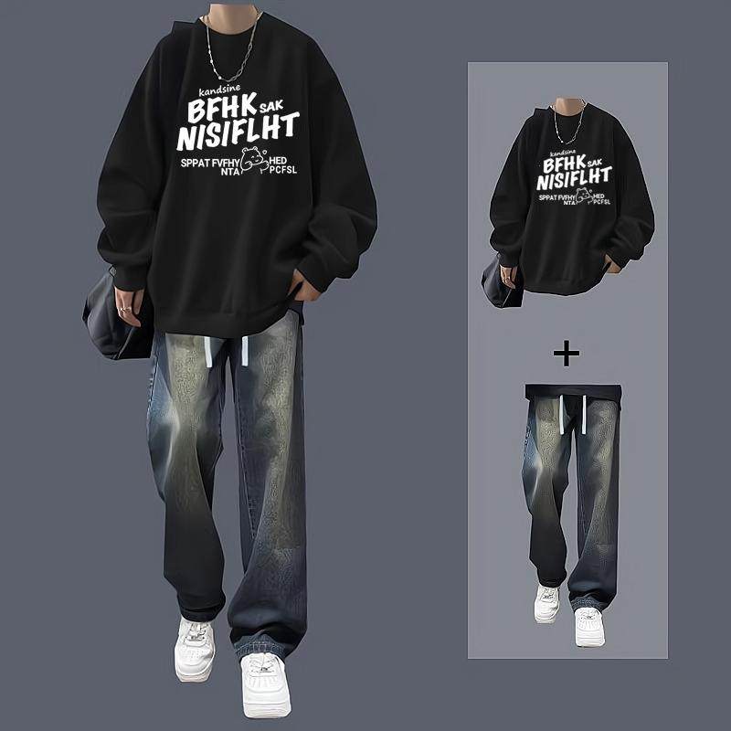 春秋冬圆领卫衣套装男生休闲搭配潮流帅气一整套男装牛仔裤两件套