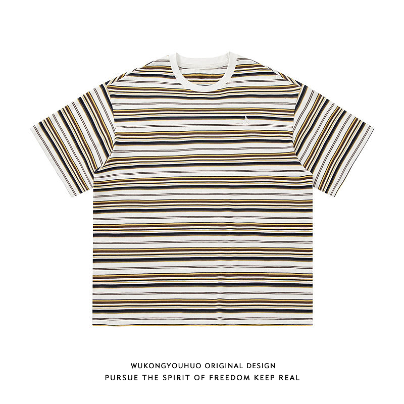 悟空有货复古日系潮牌条纹短袖T恤男女夏季宽松情侣百搭休闲上衣