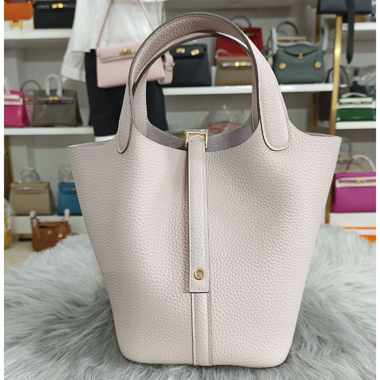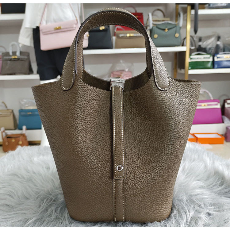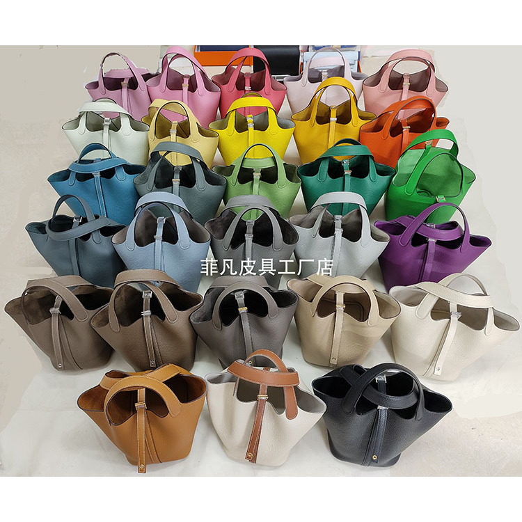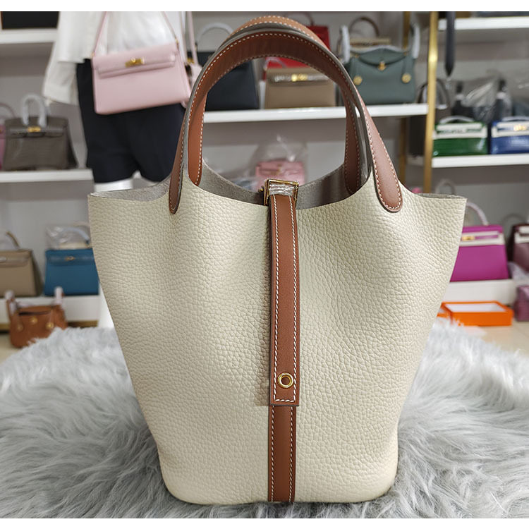 菜篮子手工蜡线缝制18/22cm荔枝纹简约拼色TC牛皮真皮女包手提包