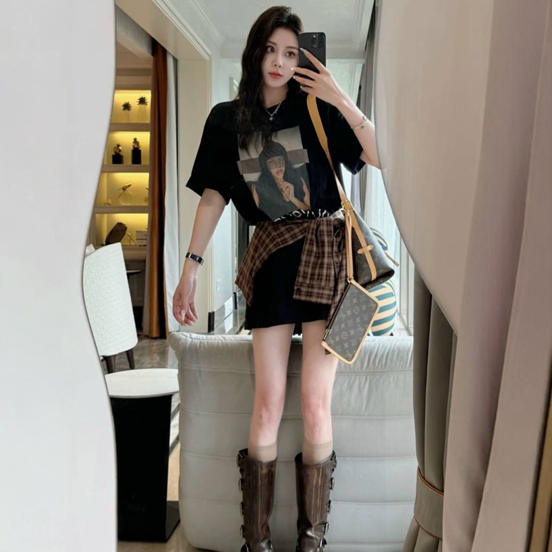 韩系时尚穿搭套装女夏季格子披肩腰封中长款印花t恤裙显瘦两件套