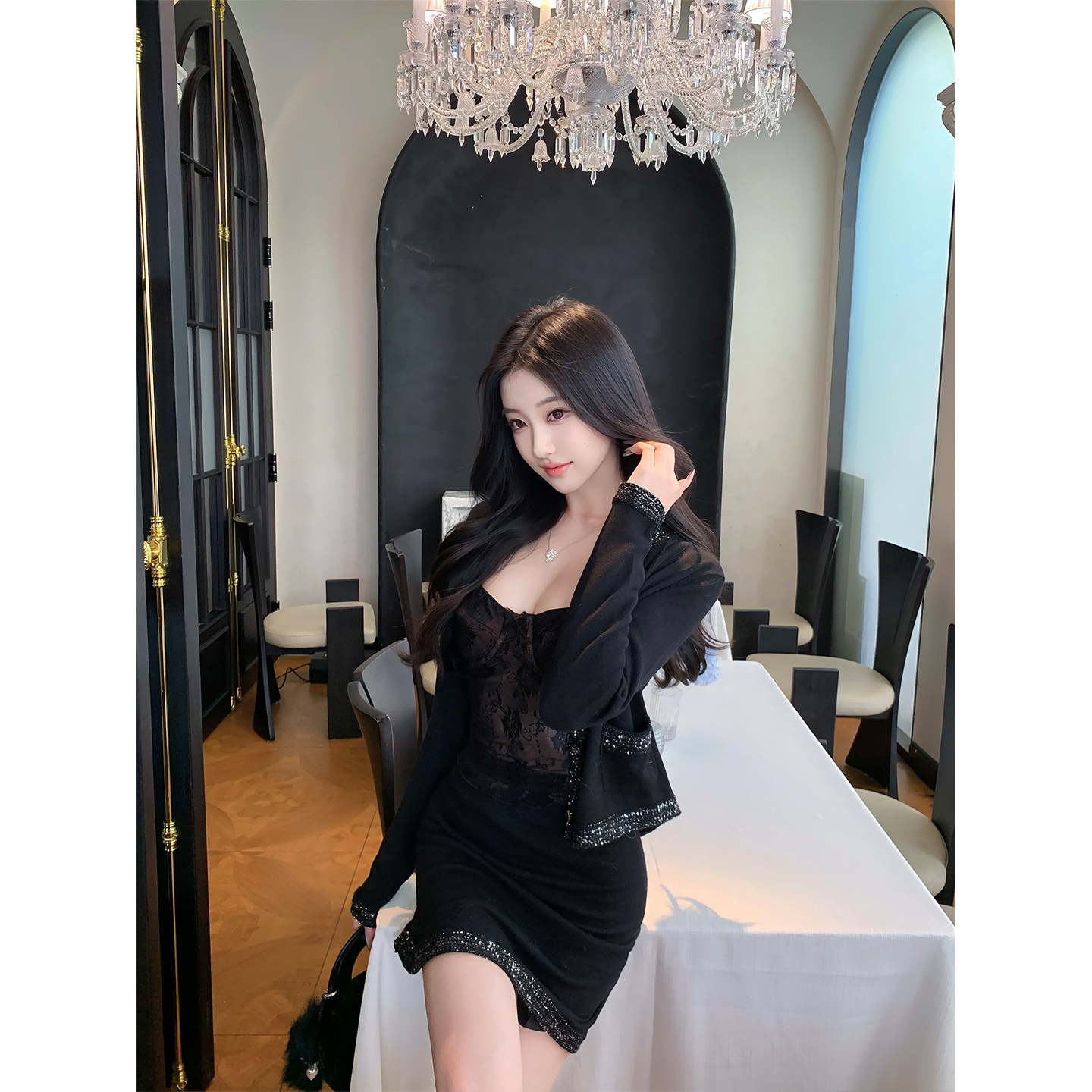 DFAY 秘境黑 蕾丝套装性感吊带上衣显瘦包臀半裙女秋冬搭配一整套