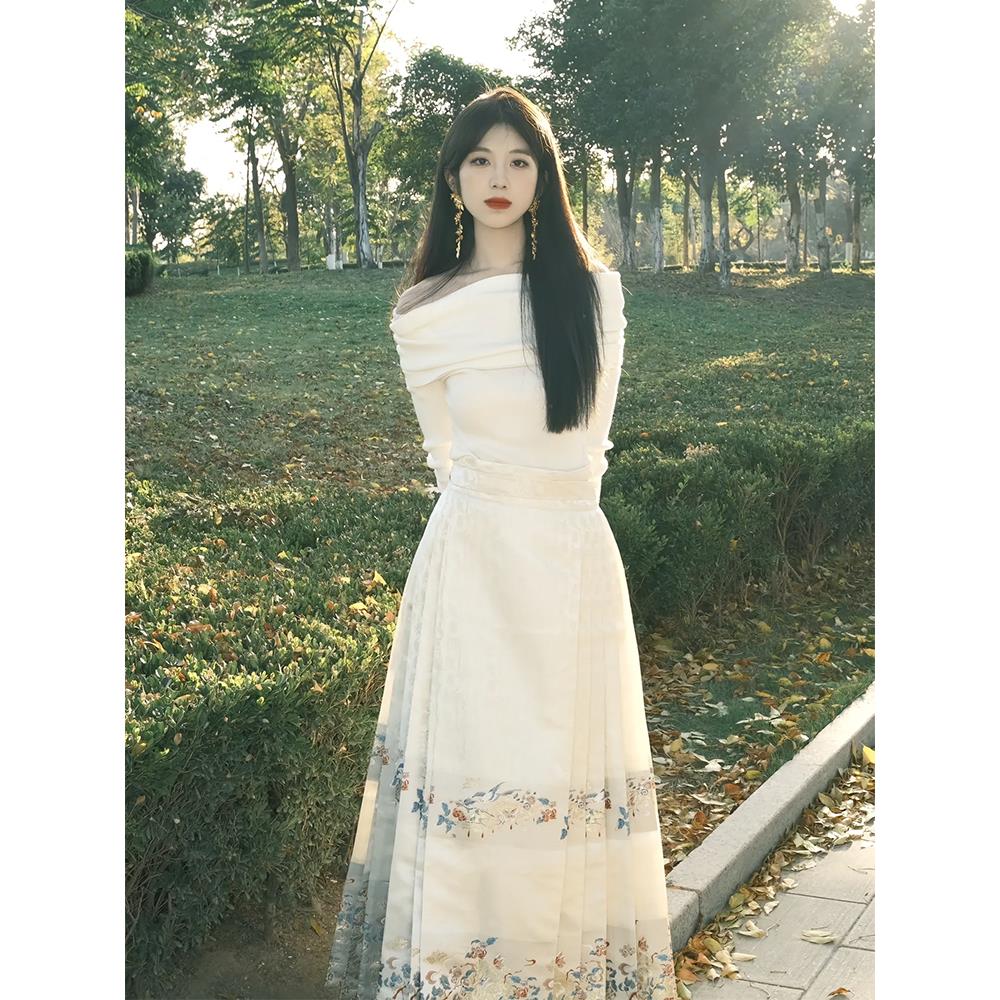 新中式京云染白色马面裙两件套装女秋冬国风一字肩上衣改良版汉服