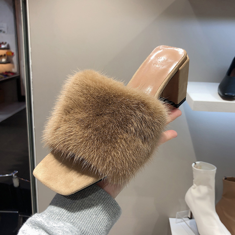 现货韩小爱毛毛拖鞋女东大门网红2024新款舒适貂毛粗高跟一字拖鞋