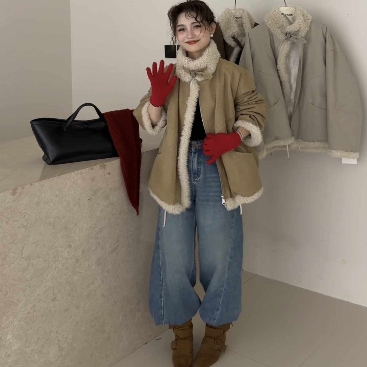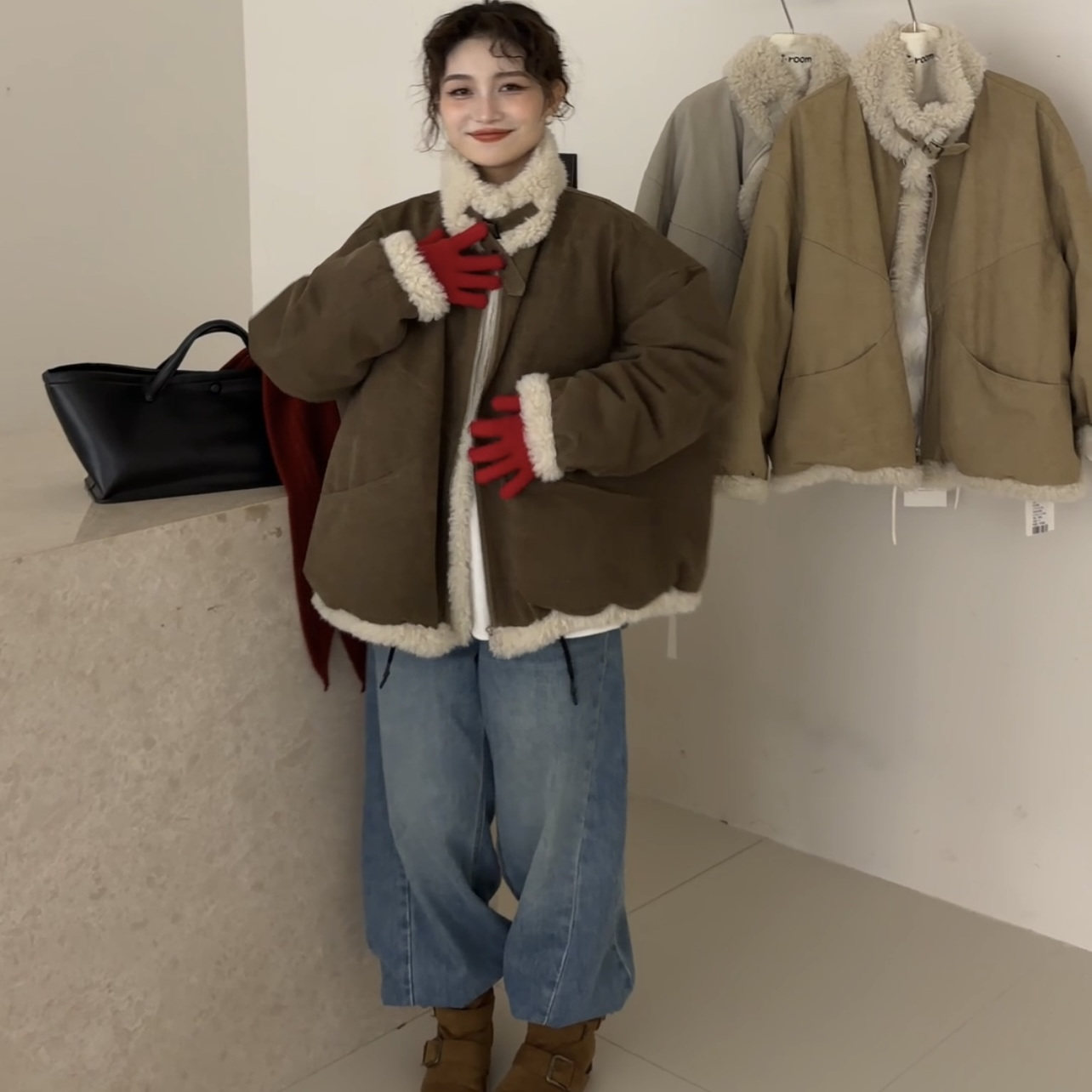 韩系立领皮毛一体外套女冬中长款加厚保暖高级感毛呢大衣8717