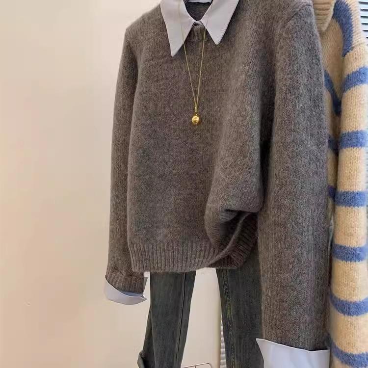 灰色假两件polo衬衫领内搭毛衣女秋冬短款慵懒风宽松打底针织上衣