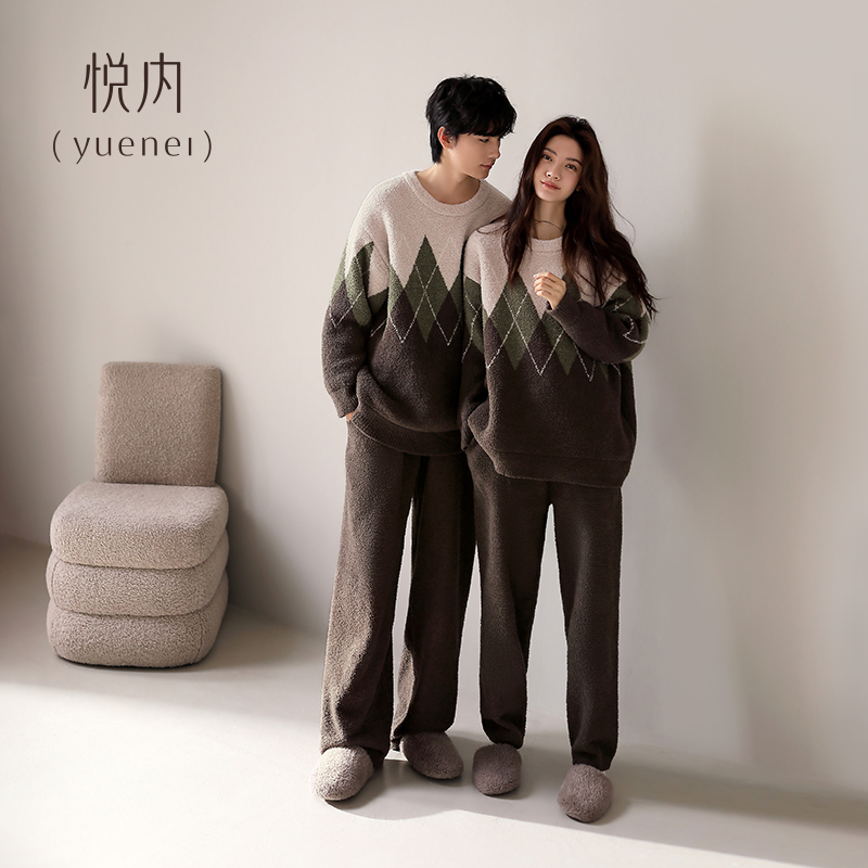 悦内半边绒情侣睡衣女士秋冬款冬季珊瑚绒加绒保暖家居服男款套头