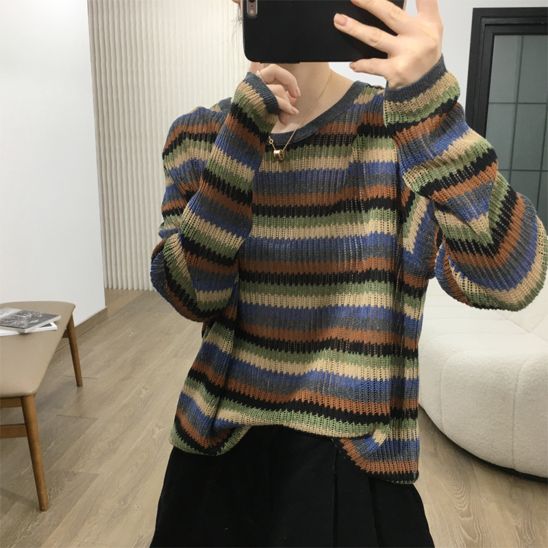细米定制~韩系撞色条纹慵懒亚麻针织衫秋季新品圆领宽松长袖上衣