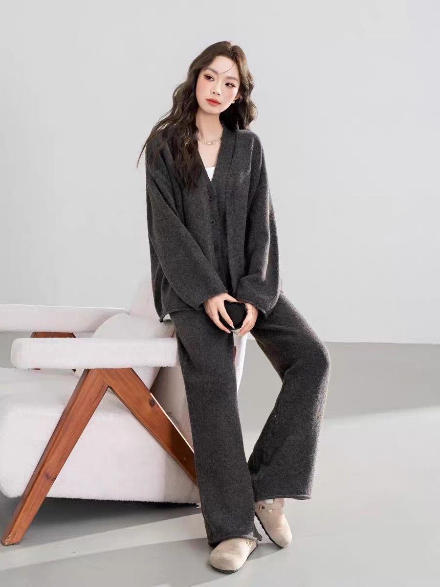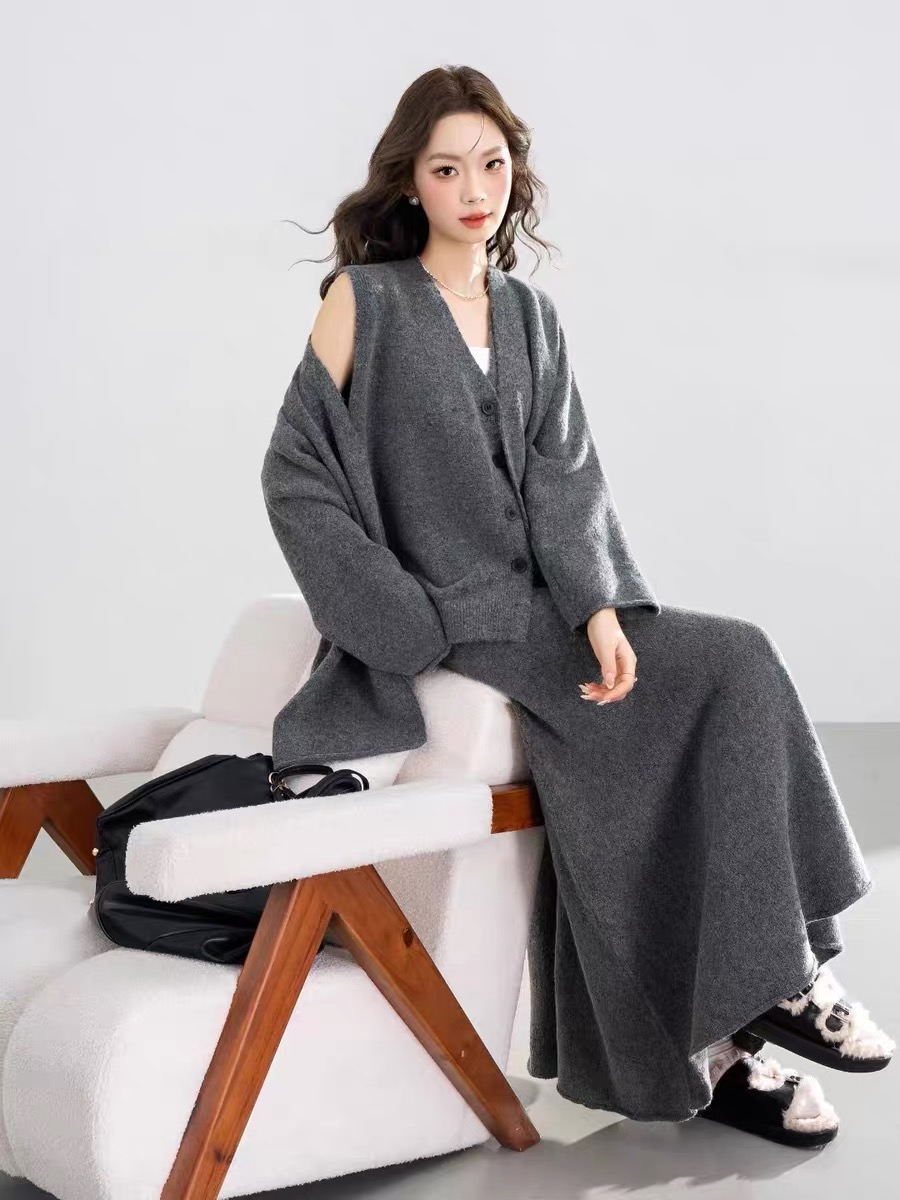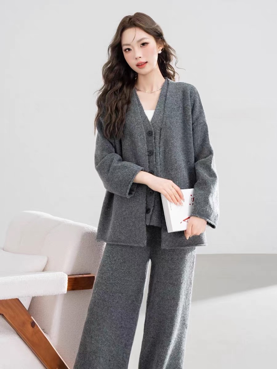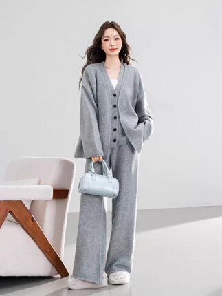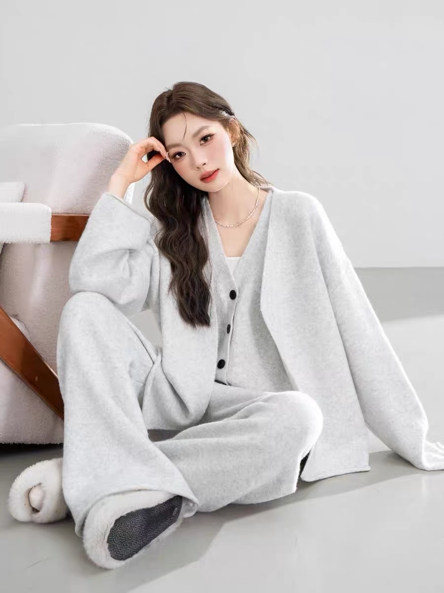 秋冬款慵懒风针织套装中长款毛衣外套针织马甲休闲阔腿长裤三件套