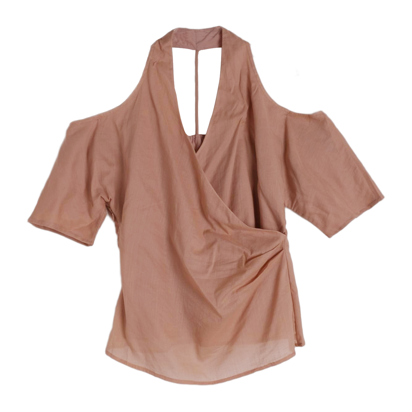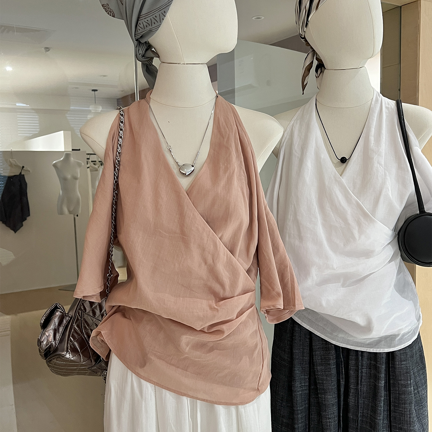 粉色挂脖露肩交叉v领衬衫女短袖露背纯欲 设计感法式小资麻料上衣