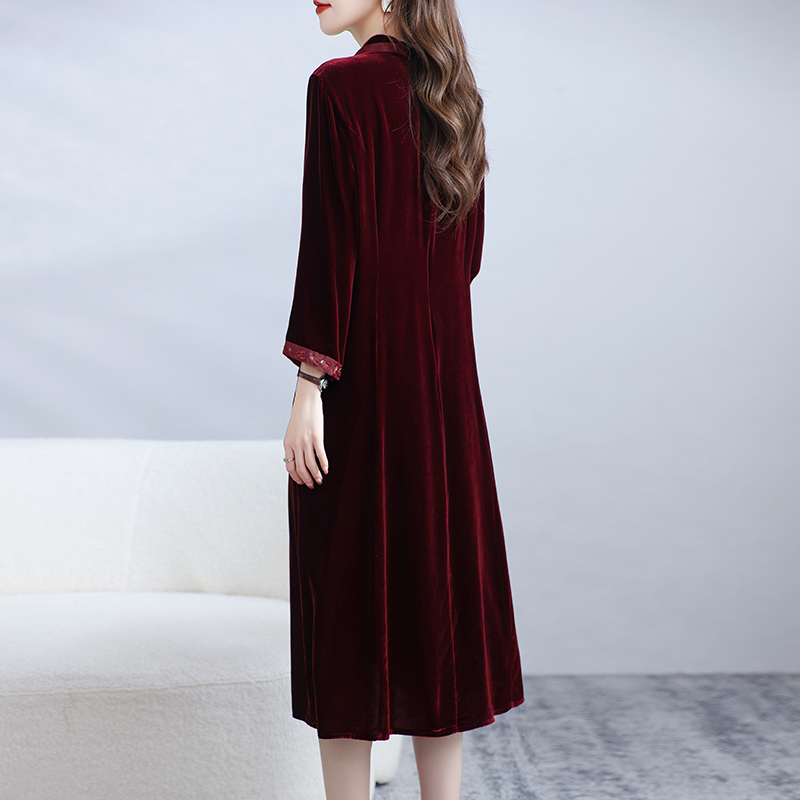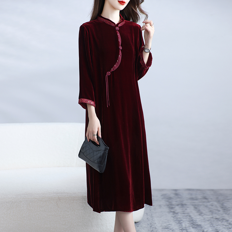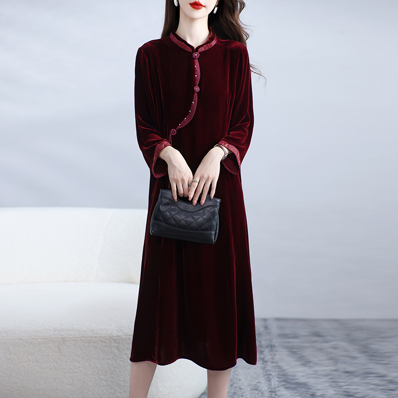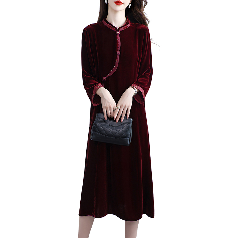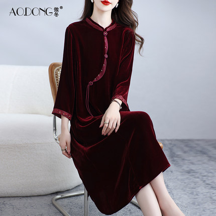 国风婚宴真丝丝绒连衣裙女喜婆婆桑蚕丝复古裙子新中式妈妈装春秋