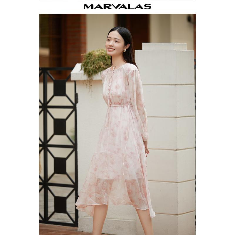 曼德诗法式春夏穿搭连衣裙女2025新款雪纺碎花裙收腰中长款A字裙