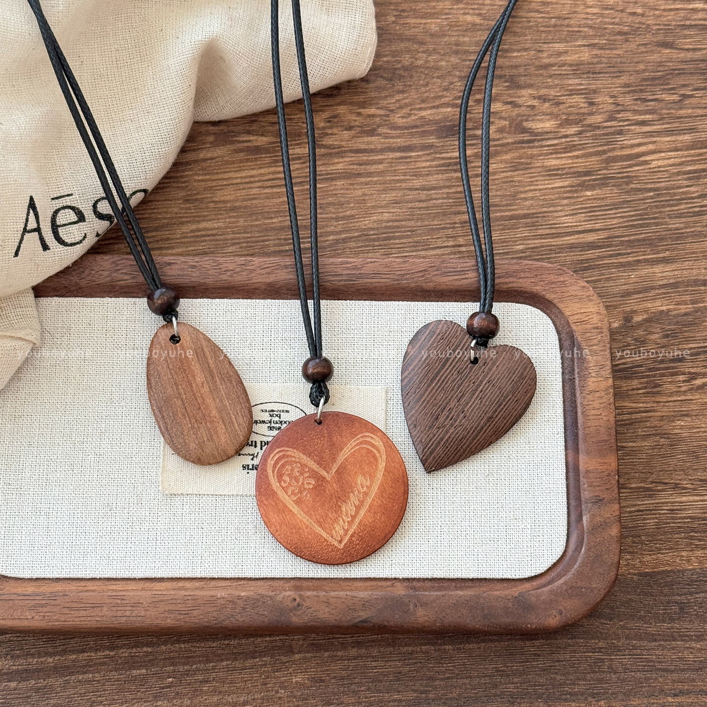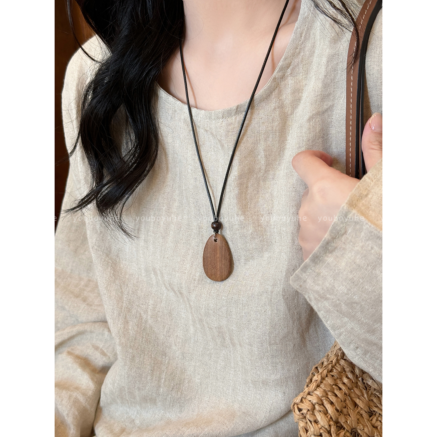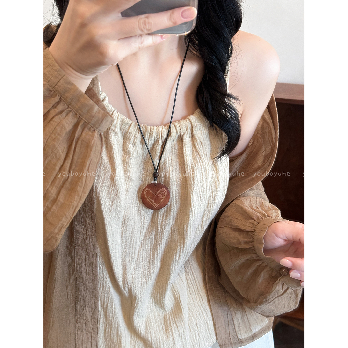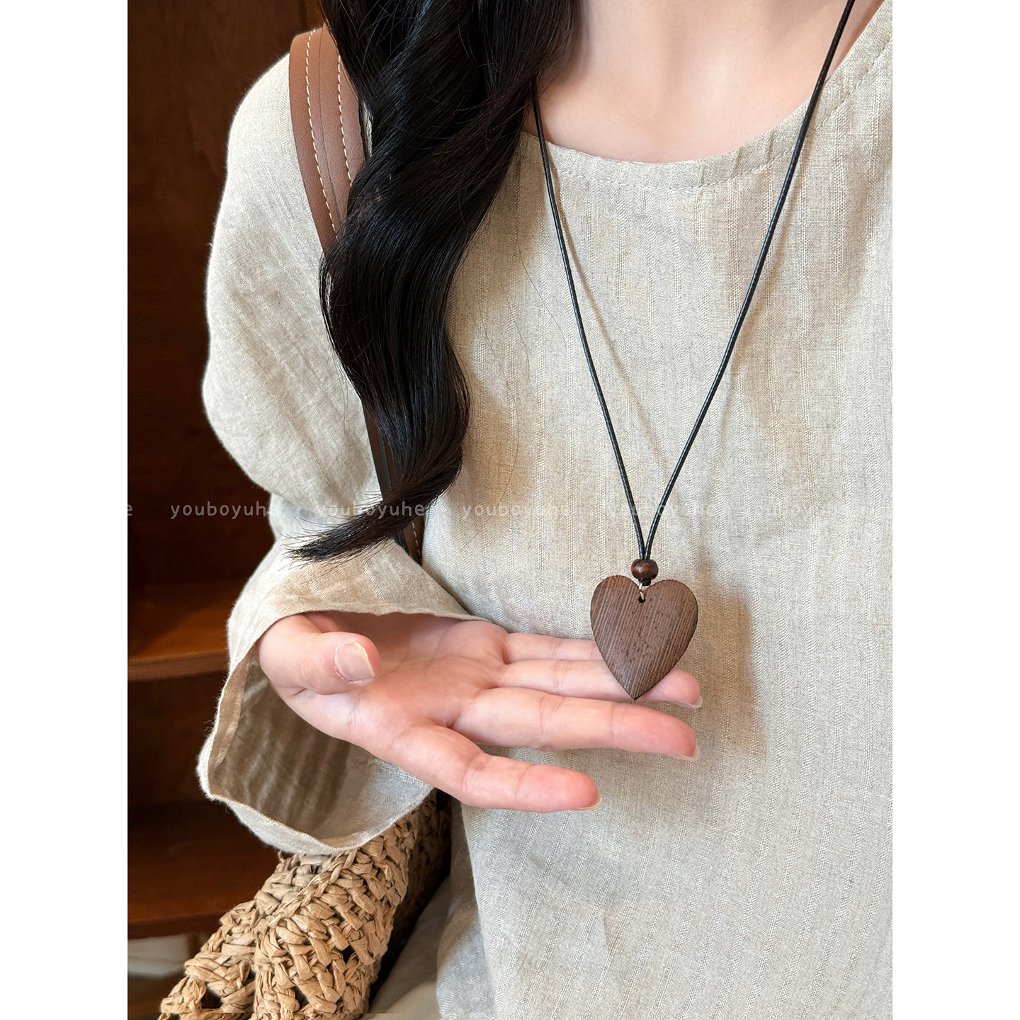 新中式木质爱心吊坠项链女复古民族风长款串珠毛衣链个性挂脖配饰